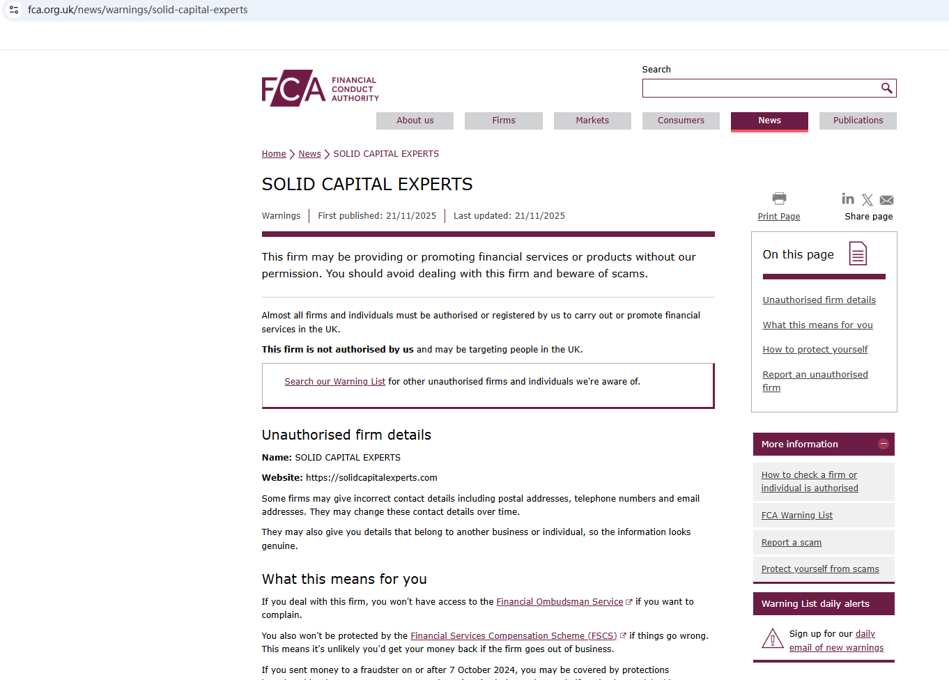 On November 21, 2025, the Financial Conduct Authority (FCA) issued a warning regarding SOLID CAPITAL EXPERTS, suspecting that this company may be offering financial services or products without the necessary authorization. https://www.fca.org.uk/news/warnings/solid-capital-experts