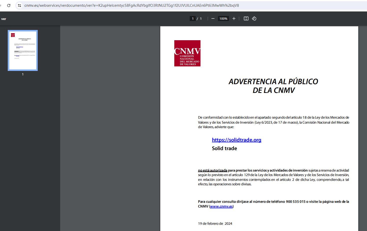 On 19 February 2024, the Comisión Nacional del Mercado de Valores (CNMV) issued a warning that SOLID TRADE was providing financial services or products without authorisation. You may visit: https://www.cnmv.es/webservices/verdocumento/ver?e=K2upHeIcemtyc58FgAcRdYbgIfO3RtNU2TGg1f2UJVUILCnUAEn6Pt63MwWh%2bqV8