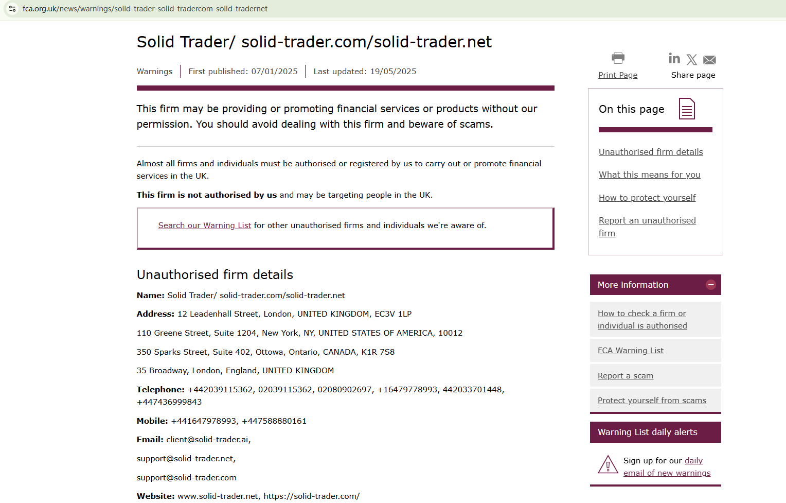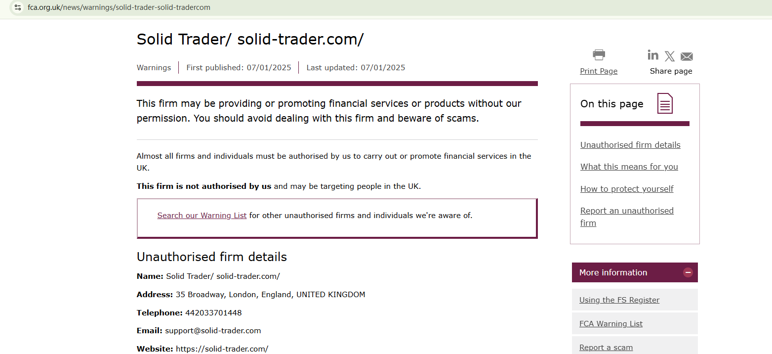 On January 7, 2025, the Financial Conduct Authority (FCA) issued a warning against Solid Trader, believing this company might be providing financial services or products without proper authorization in the UK. https://www.fca.org.uk/news/warnings/solid-trader-solid-tradercom