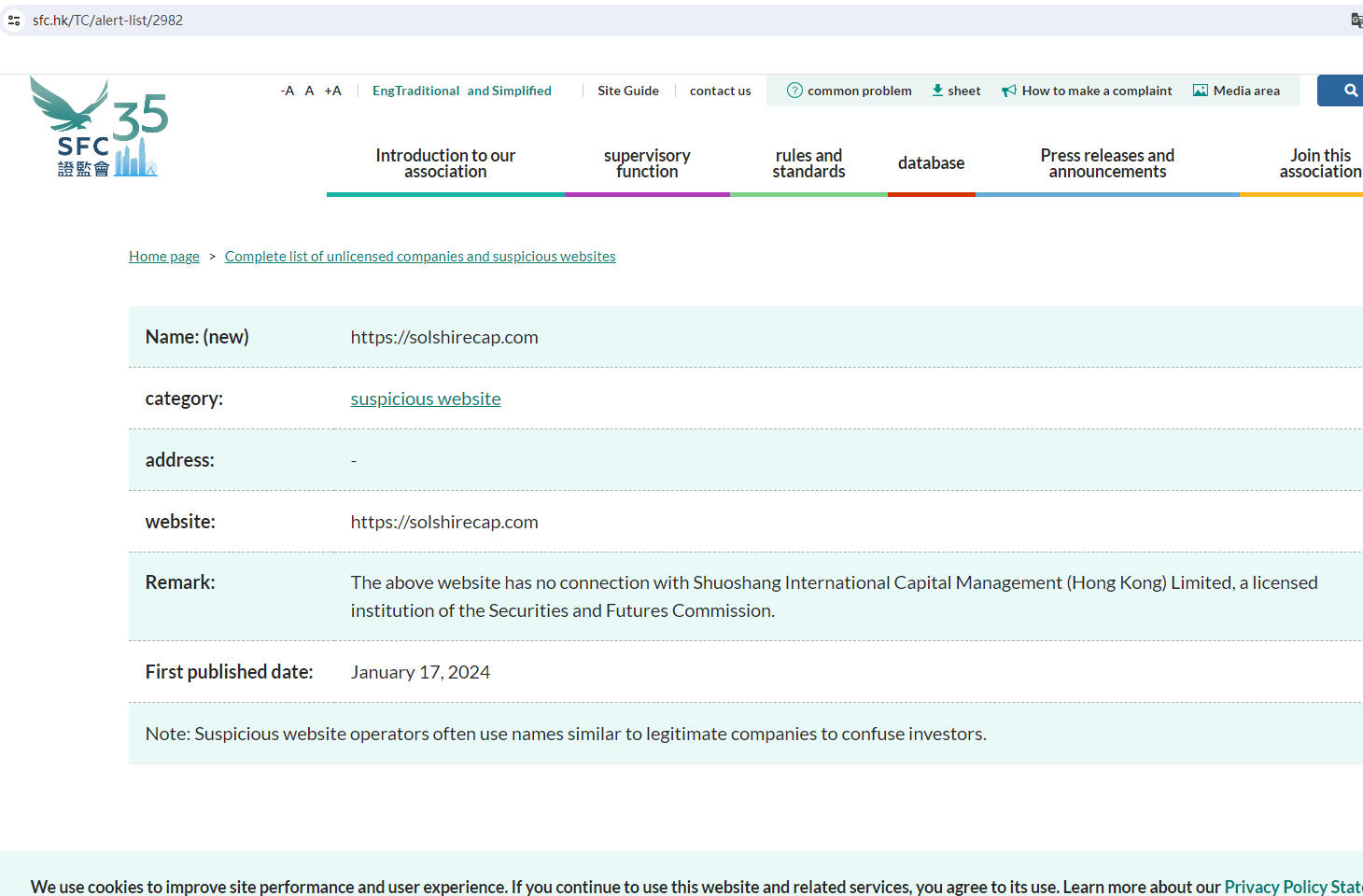 On January 17, 2024, the Securities And Futures Commission(SFC) issued a warning against Solshire, believing this company might be providing financial services or products without proper authorization in the HK. https://www.sfc.hk/TC/alert-list/2982