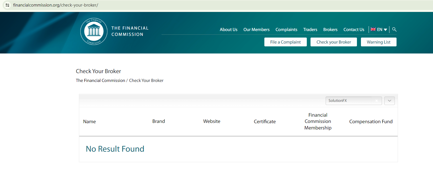 SolutionFX displays the logo of the Financial Commission on its website, seemingly to project an image of reliability. However, it is not a member of the commission, which calls into question its credibility.