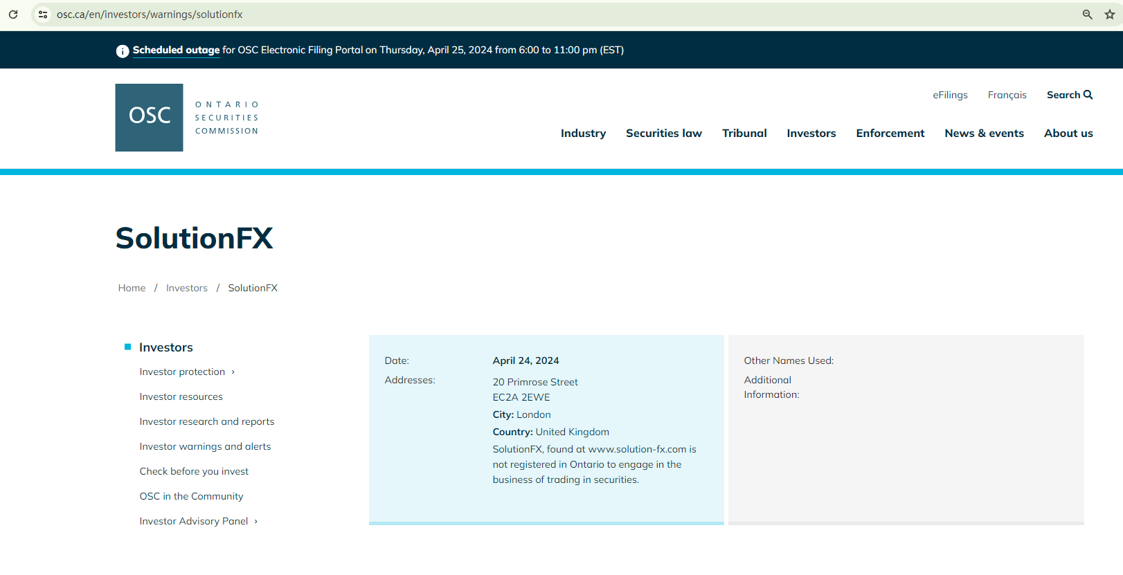 In addition, the Ontario Securities Commission (OSC) has issued a warning against SolutionFX, stating that this broker is not registered in Ontario to engage in the business of trading in securities.