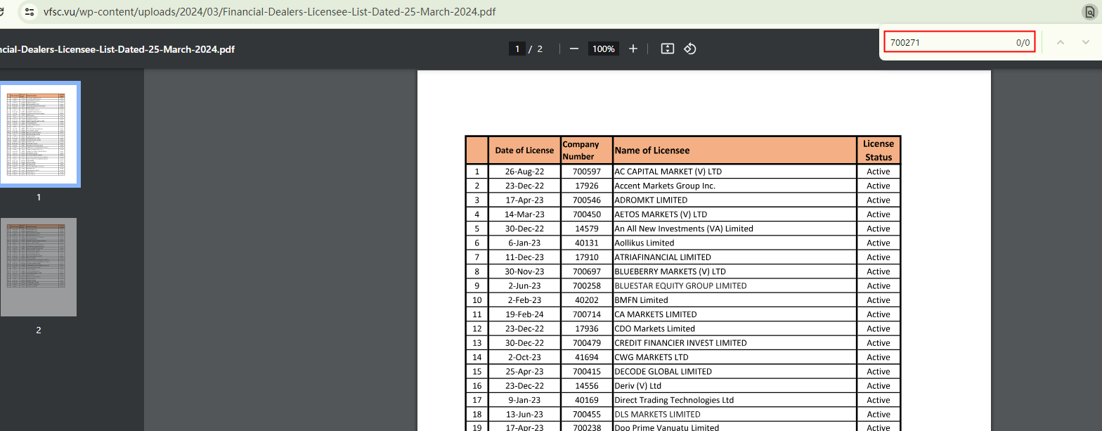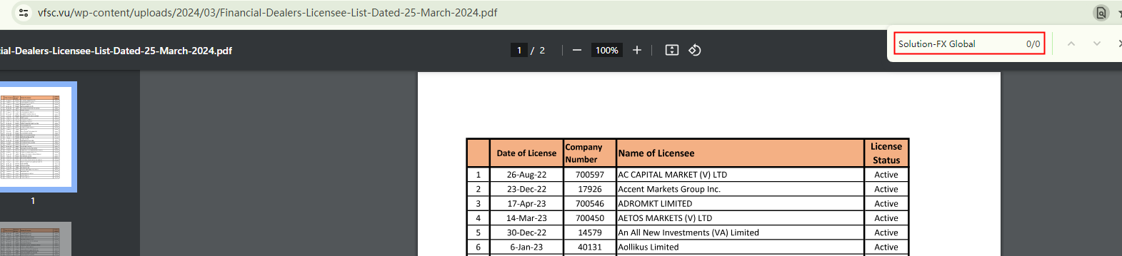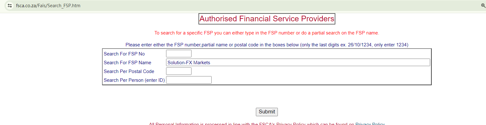 SolutionFX purports to be a forex broker, owned by Solution-FX Global Limited, a company that allegedly holds authorization from the Vanuatu Financial Services Commission (VFSC) under the number 700271. However, neither "700271" nor "Solution-FX Global" appear in the Financial Dealers Licensee List of VFSC. This indicates that SolutionFX does not fall under the jurisdiction of VFSC. Its claimed registration with the Financial Sector Conduct Authority (FSCA) also lacks substantiation.