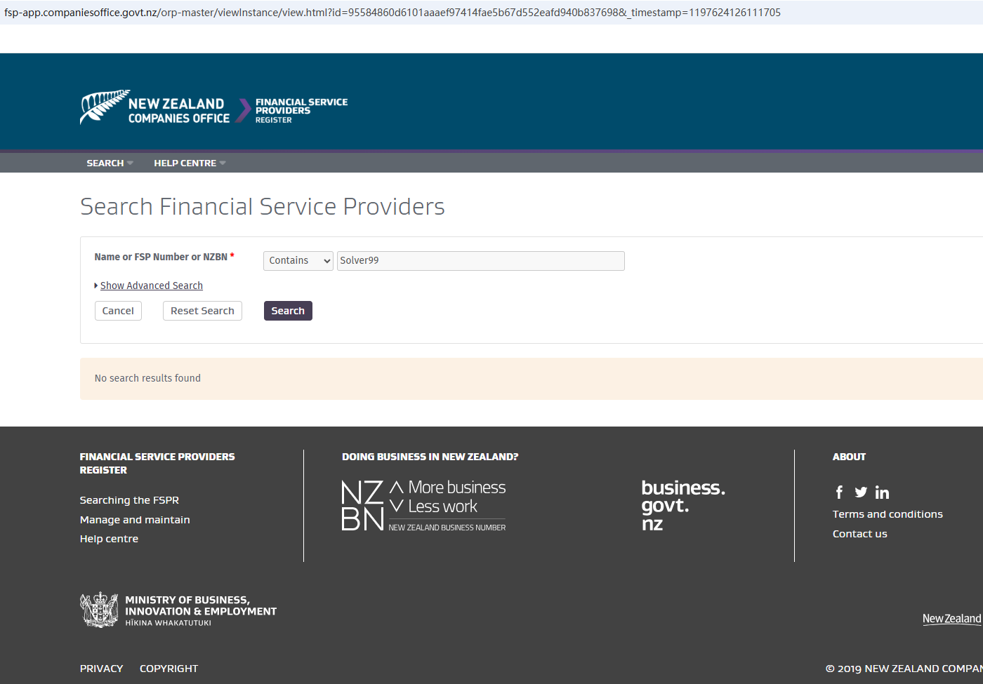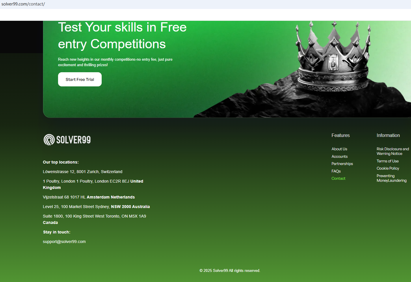According to its website, it claims to have offices in numerous locations worldwide. Upon investigation, no matching information was found in the Swiss Financial Market Supervisory Authority (FINMA), the Financial Markets Authority (NZ FMA), the Australia Securities & Investment Commission (ASIC), and the Investment Industry Regulatory Organization of Canada (IIROC). In addition, the Financial Conduct Authority (FCA) issued a warning against Solver99, as it believed this company might be providing financial services or products without proper authorization in the UK.