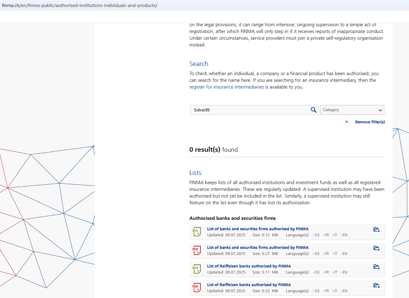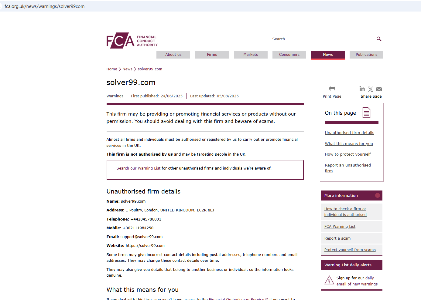On Jun 24, 2025, the Financial Conduct Authority (FCA) issued a warning against Solver99, believing this company might be providing financial services or products without proper authorization in the UK. https://www.fca.org.uk/news/warnings/solver99com