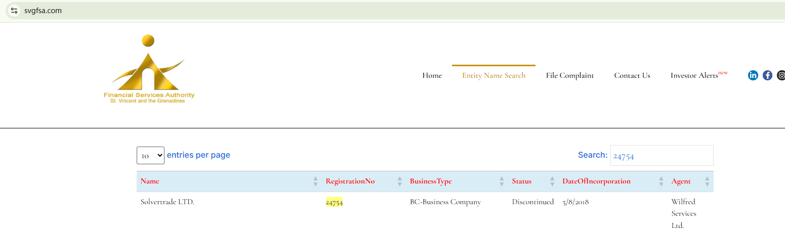 The website of Solvertrade is currently unavailable. The claimed registration with the Financial Services Authority of St. Vincent and The Grenadines (SVG FSA) has been canceled as well. All the signs indicate substantial risks of Solvertrade. Investors should be informed about the development and stay clear of it.