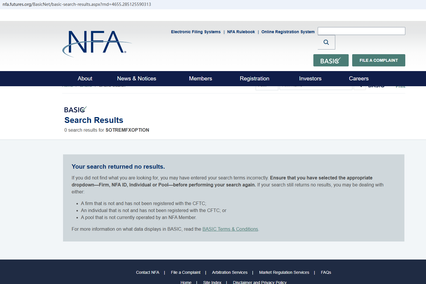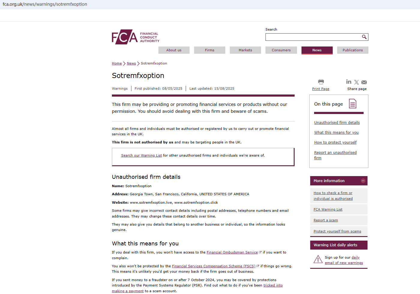 The company's website claims it is US-based, but no record was found in the NFA database. The FCA has also warned that Sotremfxoption may be offering financial services without authorization.