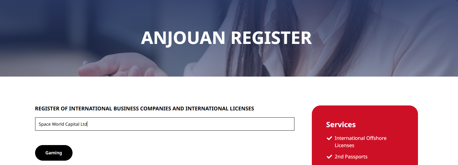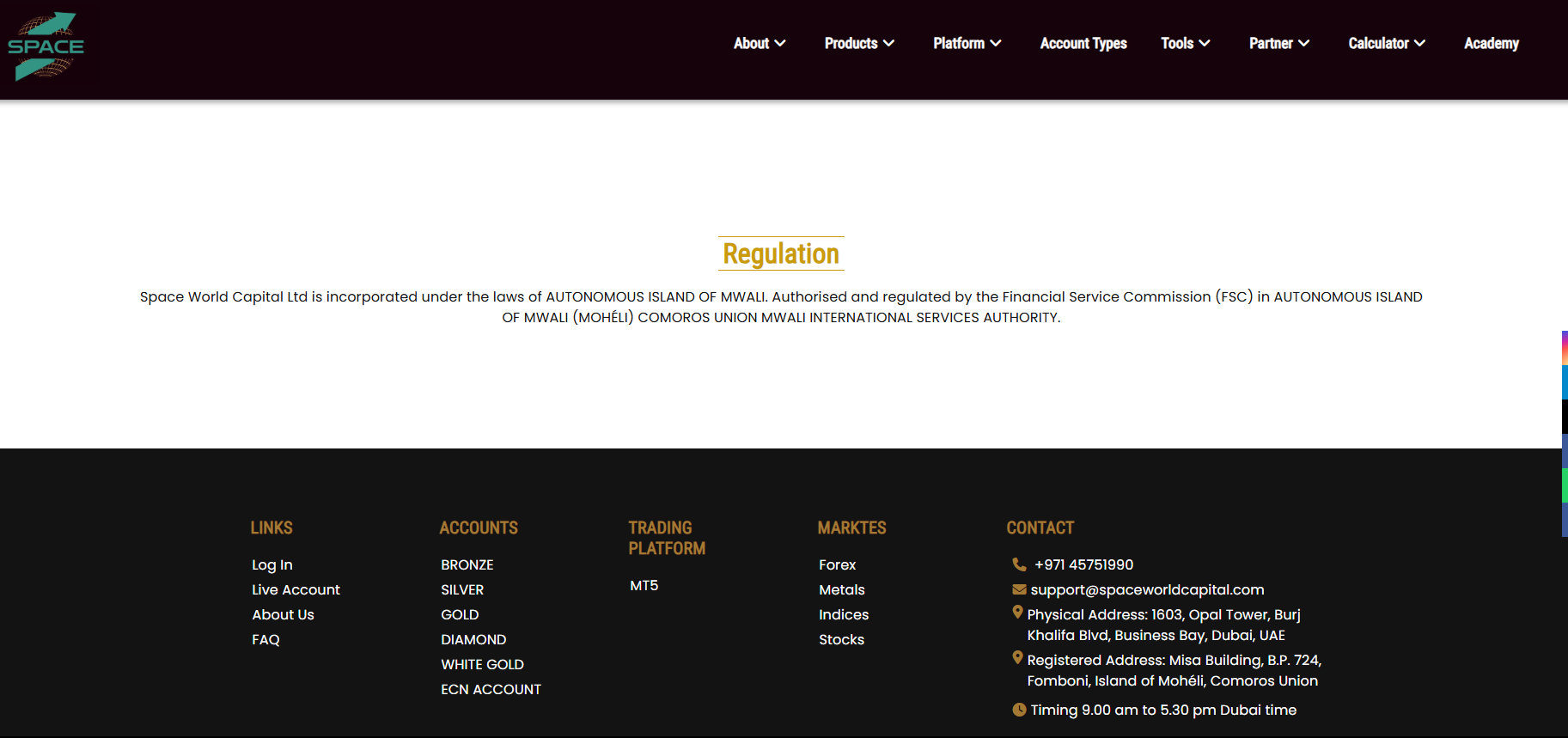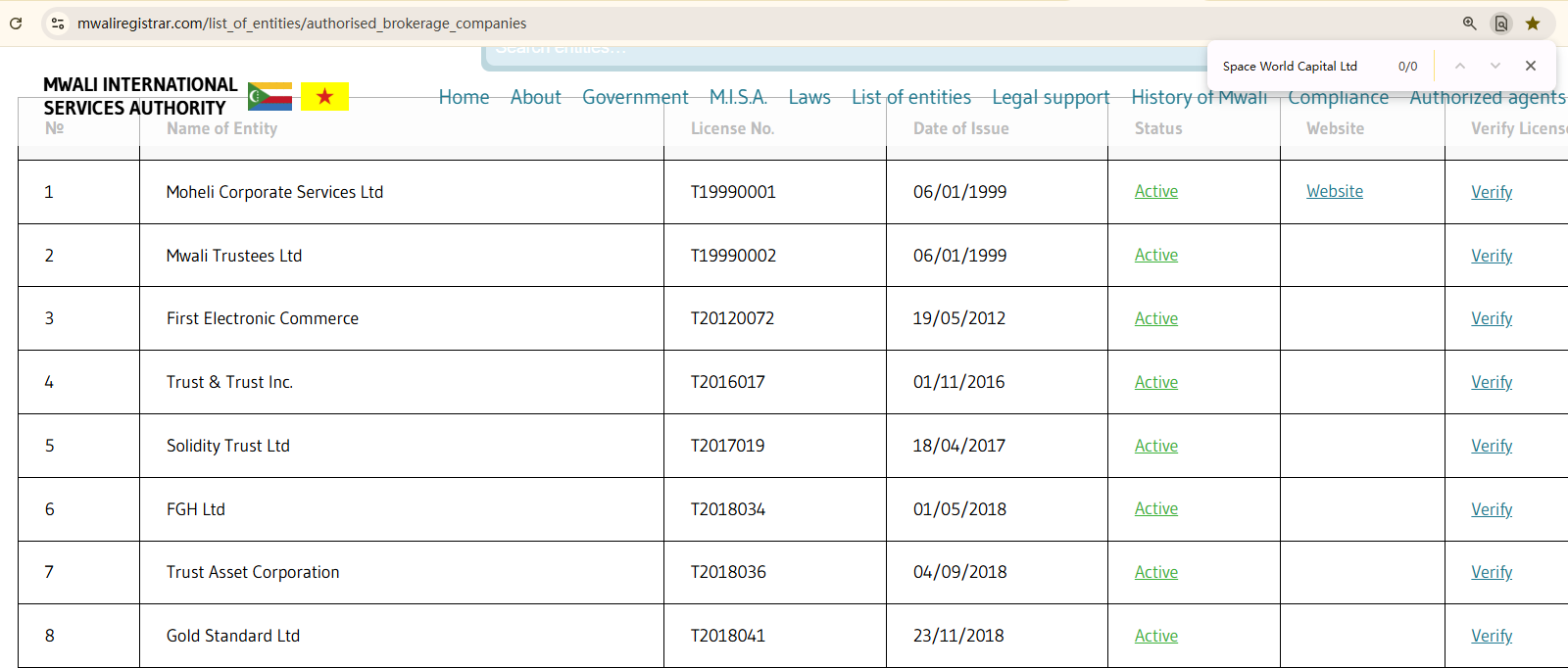 Space World Capital claims that Space World Capital Ltd is regulated by the Financial Service Commission (FSC) of the Autonomous Island of Mwali. However, there is no such regulator in Comoros. Furthermore, upon thorough verification, we found no record of this entity in either of MWALI’s two official regulatory bodies: the MWALI International Services Authority (MISA) or the Anjouan Offshore Finance Authority (AOFA).