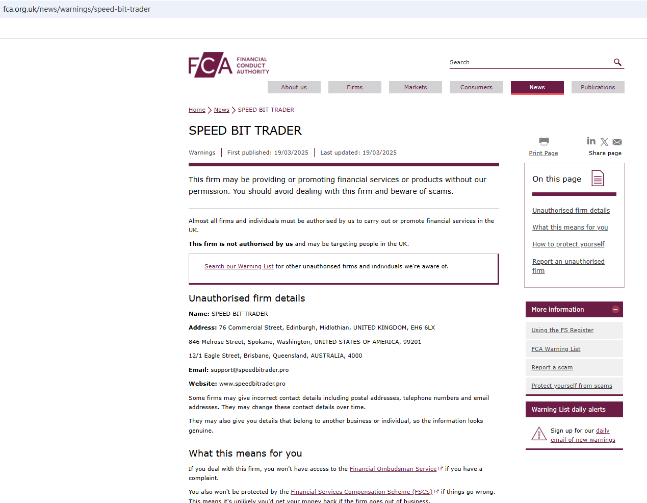 On March 19, 2025, the Financial Conduct Authority (FCA) issued a warning against SPEED BIT TRADER for the lack of the required authorization. https://www.fca.org.uk/news/warnings/speed-bit-trader