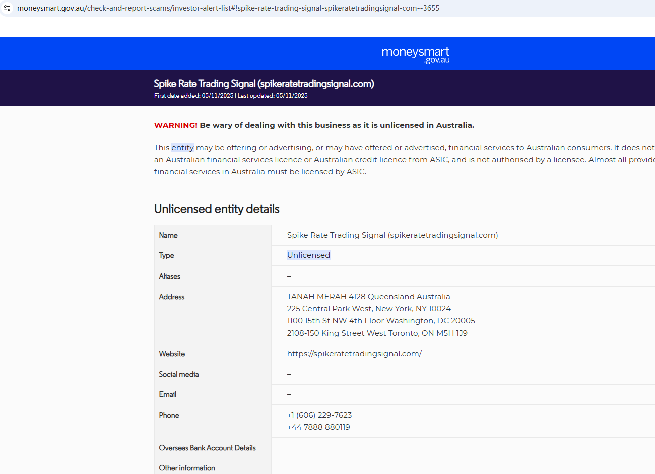 On Nov 5, 2025, the Australian Securities & Investments Commission (ASIC) issued a warning against Spike Rate Trading Signal, believing this company might be providing financial services or products without proper authorization. https://moneysmart.gov.au/check-and-report-scams/investor-alert-list#!spike-rate-trading-signal-spikeratetradingsignal-com--3655
