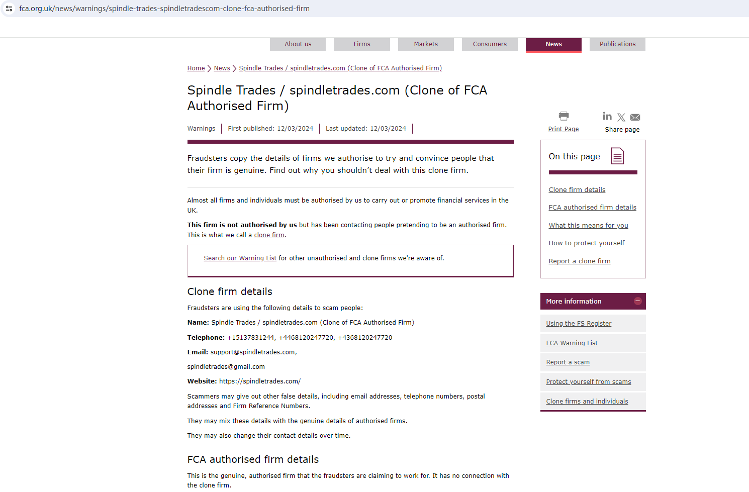 On March 12, 2024, the Financial Conduct Authority (FCA) issued a warning against Spindle Trades, identifying this company as a clone of an FCA-authorized firm. https://www.fca.org.uk/news/warnings/spindle-trades-spindletradescom-clone-fca-authorised-firm