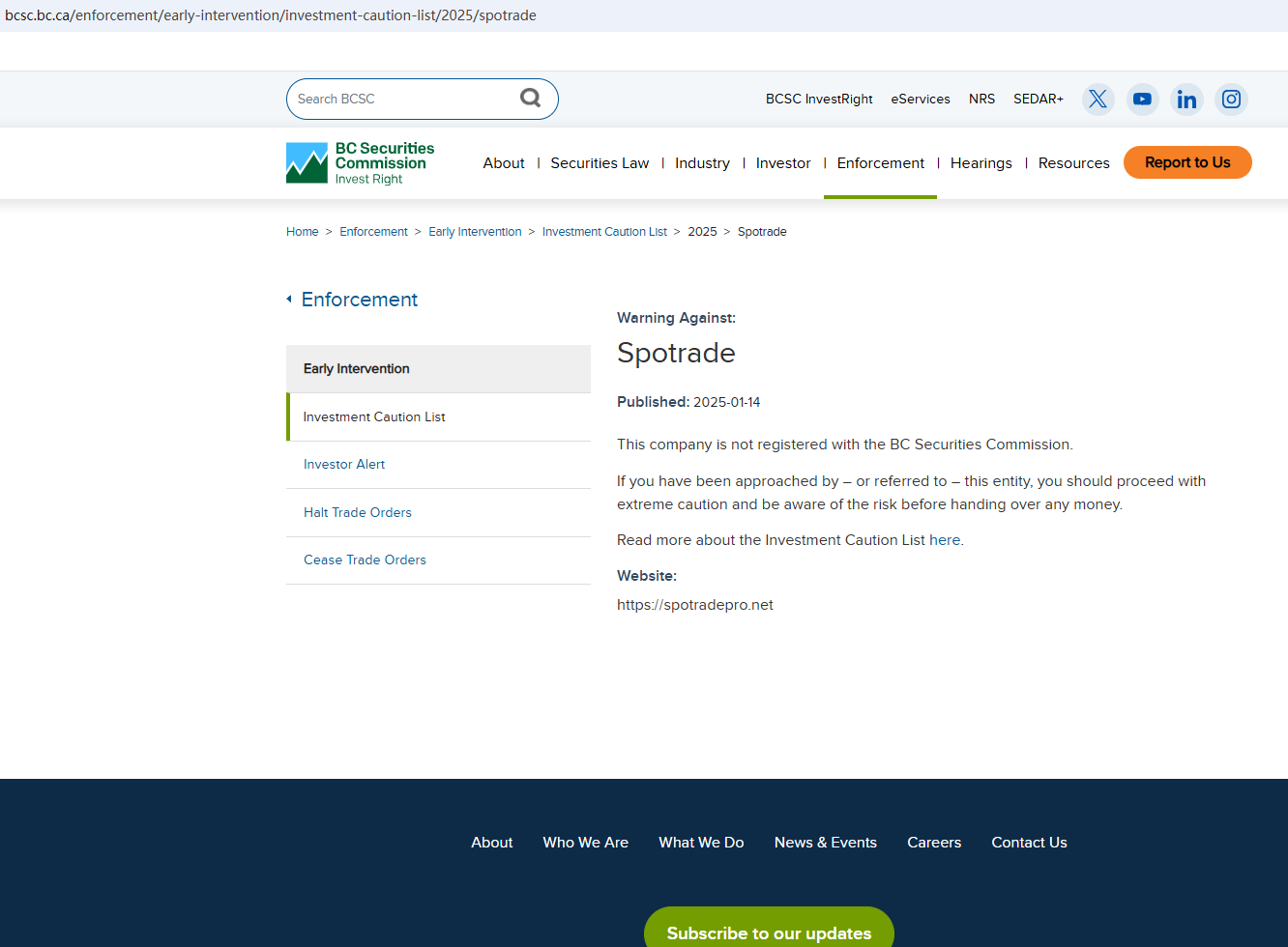 On 14 January 2025, the British Columbia Securities Commission (BCSC) issued a warning that Spotrade was providing financial services or products without authorisation. You may visit: https://www.bcsc.bc.ca/enforcement/early-intervention/investment-caution-list/2025/spotrade