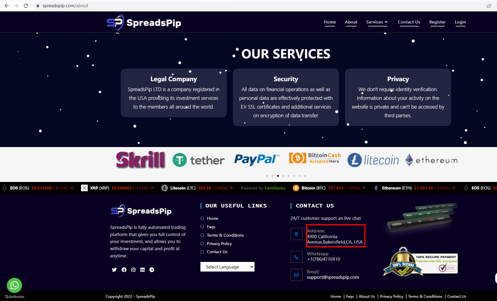 There is no any regulatory information on its website. This broker locates in U.S.A, but we don't find the correct information on National Futures Association (NFA) matching to SpreadsPip. The truth is that SpreadsPip is not under valid regulation by any regulators to do forex. Investors' funds in this broker are unsafe and cannot be protected by any law.