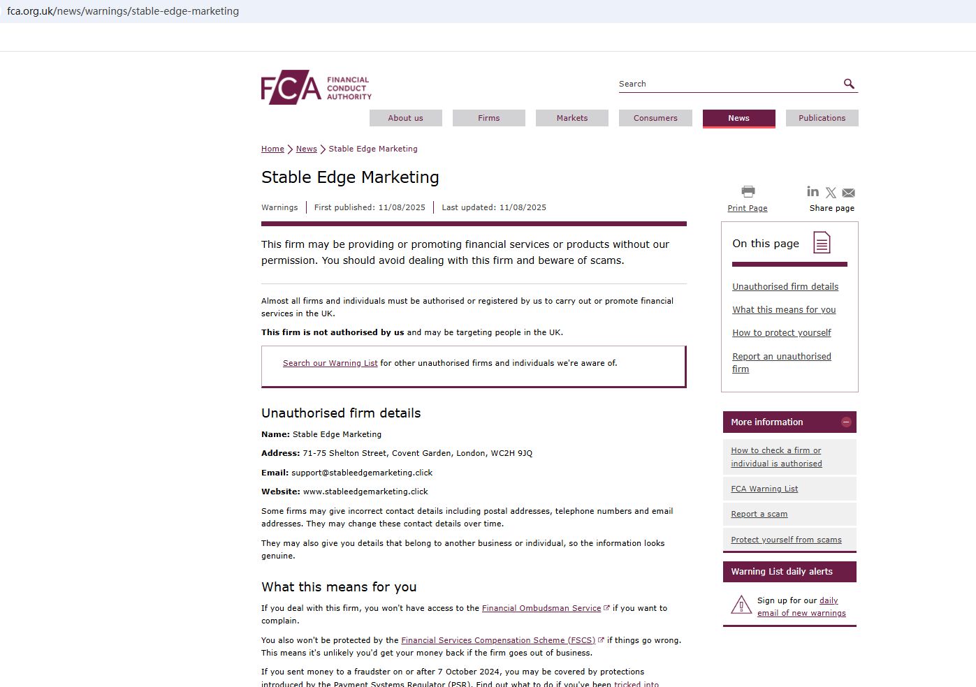 On Aug 11, 2025, the Financial Conduct Authority (FCA) issued a warning against Stable Edge Marketing, believing this company might be providing financial services or products without proper authorization in the UK. https://www.fca.org.uk/news/warnings/stable-edge-marketing