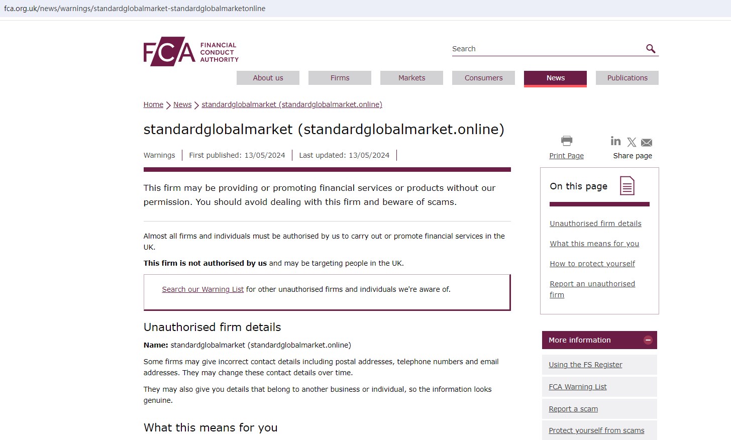 And the FCA issued a warning that standardglobalmarket (standardglobalmarket.online) was providing financial services or products in the UK without authorisation.