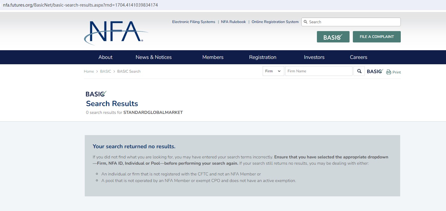 Upon investigation, we found that standardglobalmarket (standardglobalmarket.online) is not authorized by the United Kingdom Financial Conduct Authority (FCA), also is not regulated by the National Futures Association (NFA) in the US.