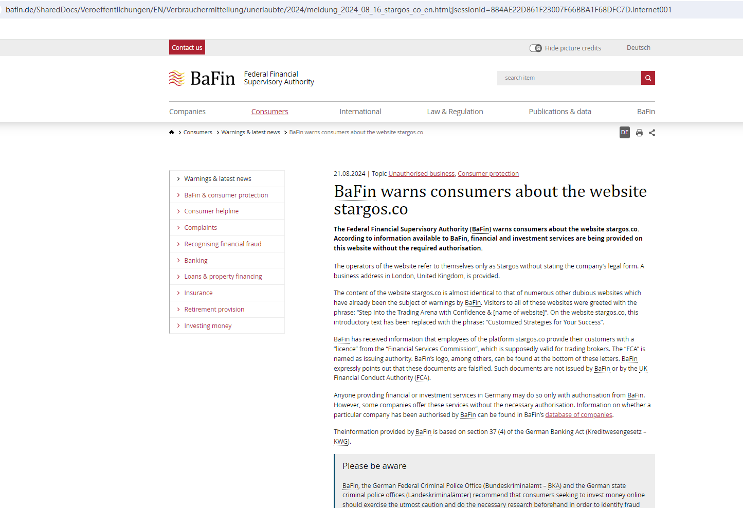 On August 21, 2024, the Federal Financial Supervisory Authority (BaFin) warned consumers about the website stargos.co, stating that the financial and investment services are being provided on this website without the required authorization. https://www.bafin.de/SharedDocs/Veroeffentlichungen/EN/Verbrauchermitteilung/unerlaubte/2024/meldung_2024_08_16_stargos_co_en.html;jsessionid=884AE22D861F23007F66BBA1F68DFC7D.internet001