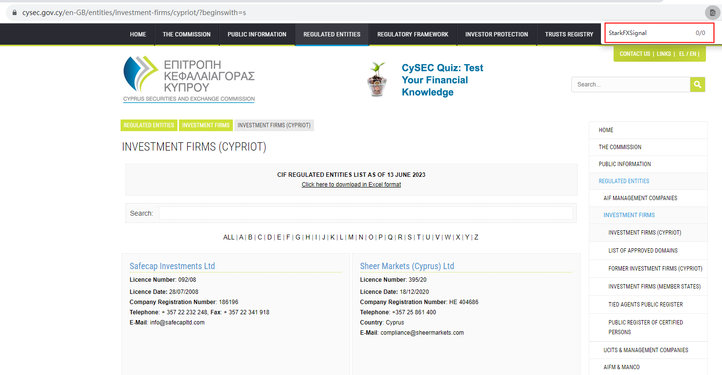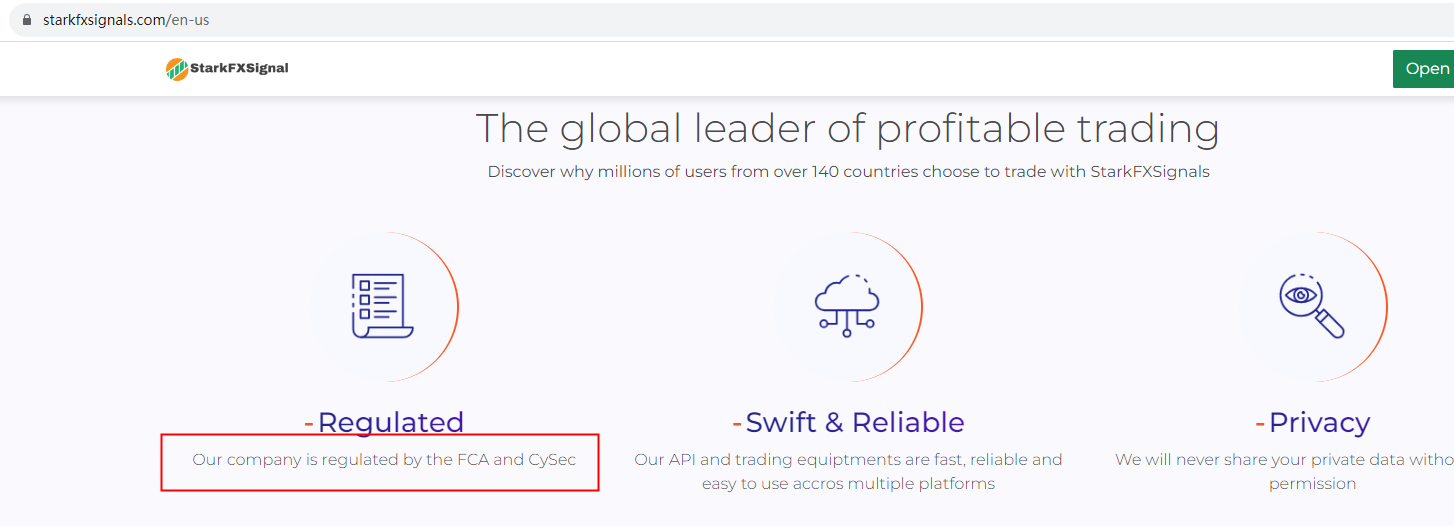 StarkFXSignal claims to be regulated by Financial Conduct Authority (FCA) and Cyprus Securities and Exchange Commission (CySEC), but we found it was unauthorized on FCA and had no matching results on CySEC. It is a red flag.