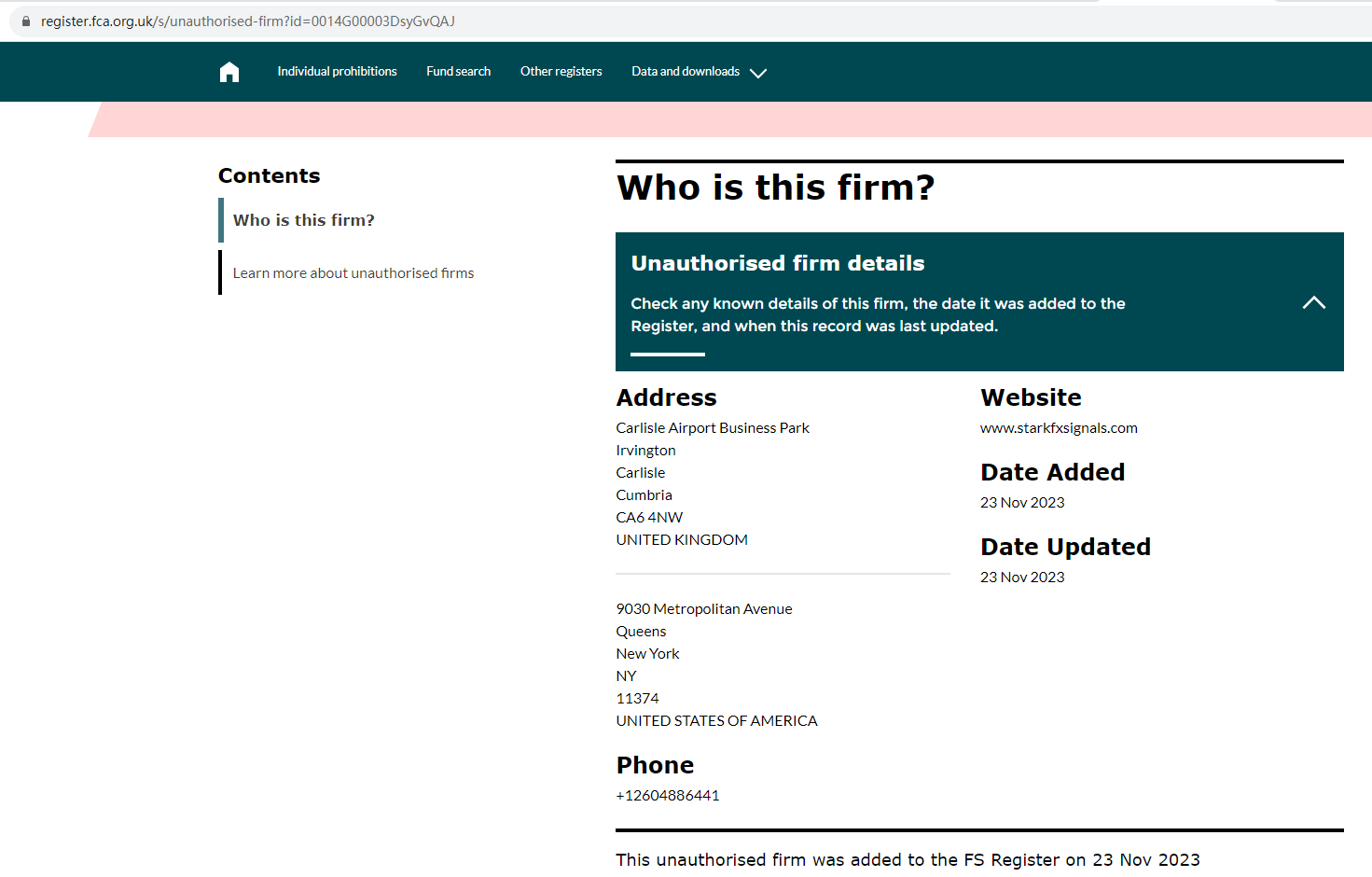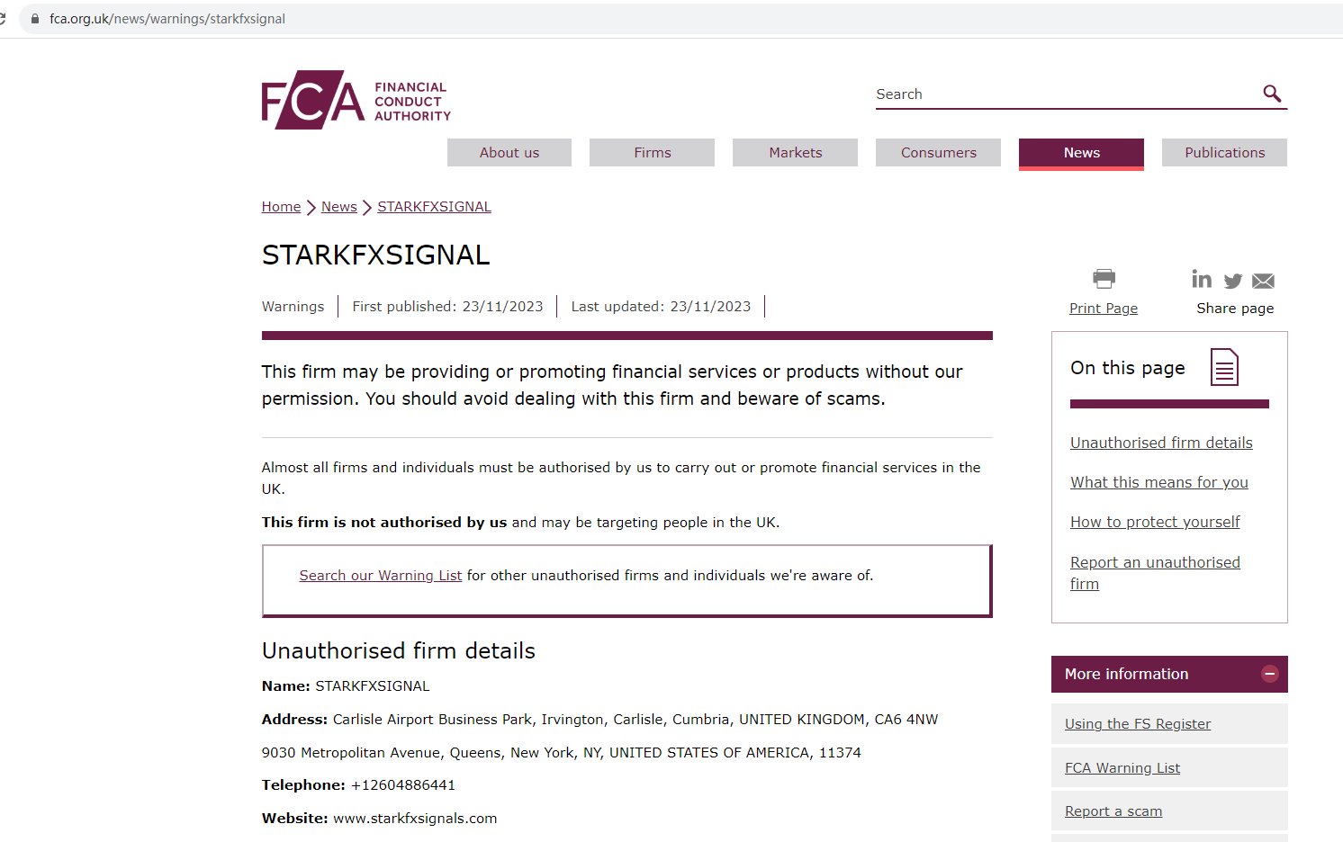 On 23 November 2023, the United Kingdom Financial Conduct Authority (UK FCA) issued a warning that StarkFXSignal was providing financial services or products in the UK without authorisation. You may visit: https://www.fca.org.uk/news/warnings/starkfxsignal
