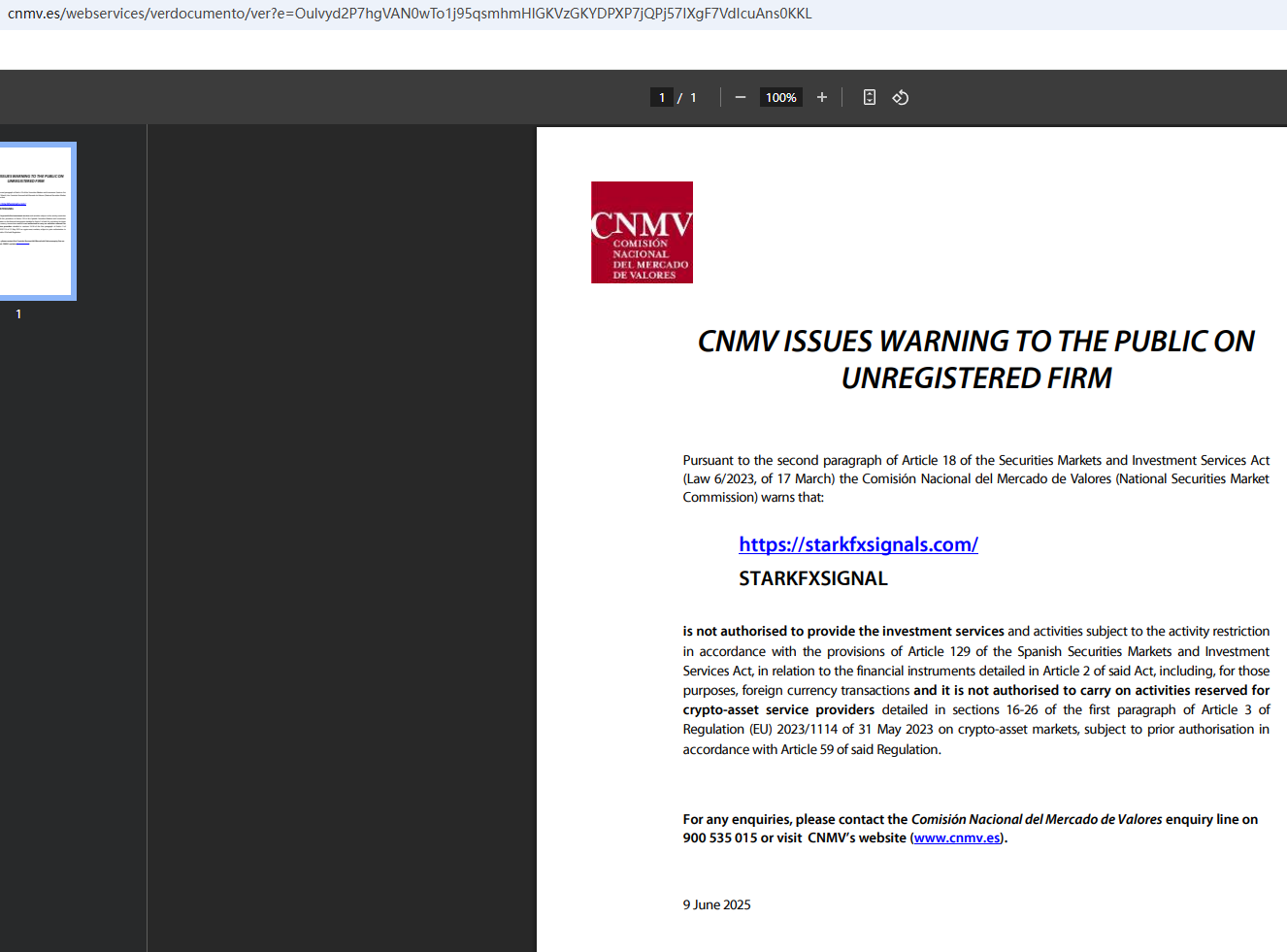 On June 9, 2025, the National Securities Market Commission (CNMV) issued a warning against StarkFXSignal, believing this company might be providing financial services or products without proper authorization. https://www.cnmv.es/webservices/verdocumento/ver?e=Oulvyd2P7hgVAN0wTo1j95qsmhmHlGKVzGKYDPXP7jQPj57IXgF7VdIcuAns0KKL