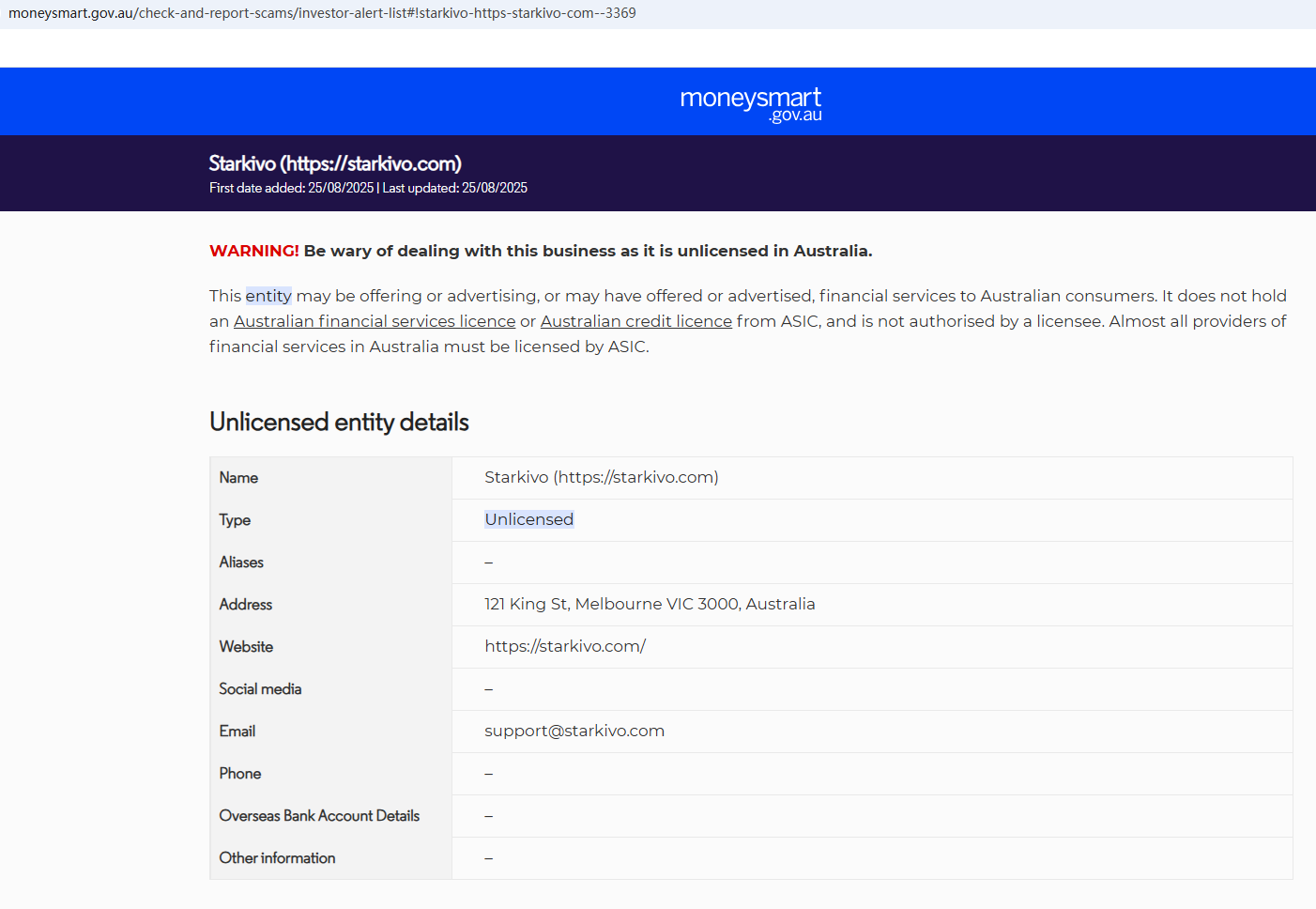 On Aug 25, 2025, the Australian Securities & Investments Commission (ASIC) issued a warning against Starkivo, believing this company might be providing financial services or products without proper authorization. https://moneysmart.gov.au/check-and-report-scams/investor-alert-list#!starkivo-https-starkivo-com--3369