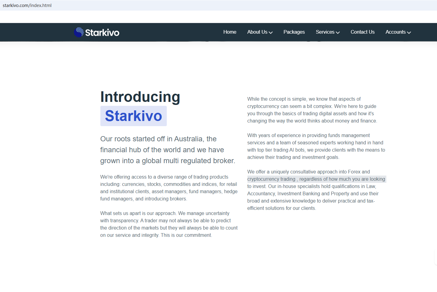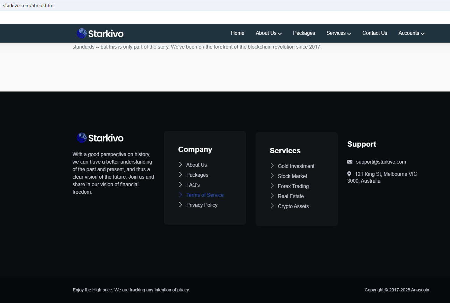 According to its website, it is located in Australia. Upon investigation, we found that the Australian Securities & Investments Commission (ASIC) issued a warning against Starkivo, believing this company might be providing financial services or products without proper authorization.