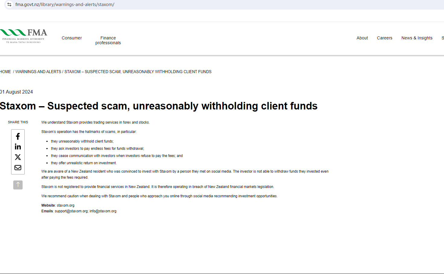In addition, the New Zealand Financial Markets Authority (FMA) issued a warning against Staxom, saying it falsely claims to be an incorporated company in New Zealand.