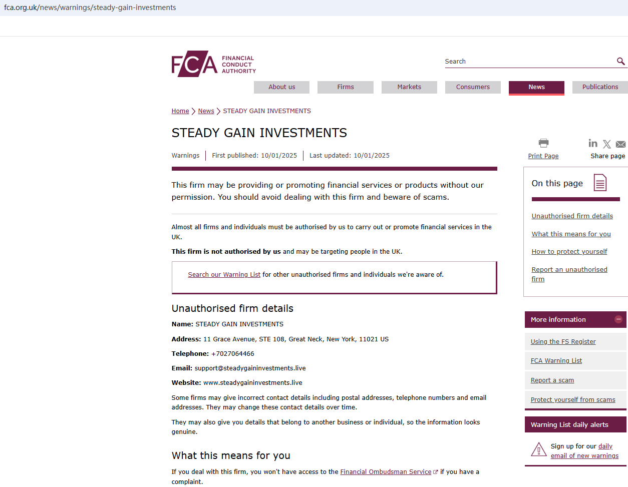 In addition, the Financial Conduct Authority (FCA) issued a warning against STEADY GAIN INVESTMENTS, believing this company might be providing financial services or products without proper authorization in the UK.