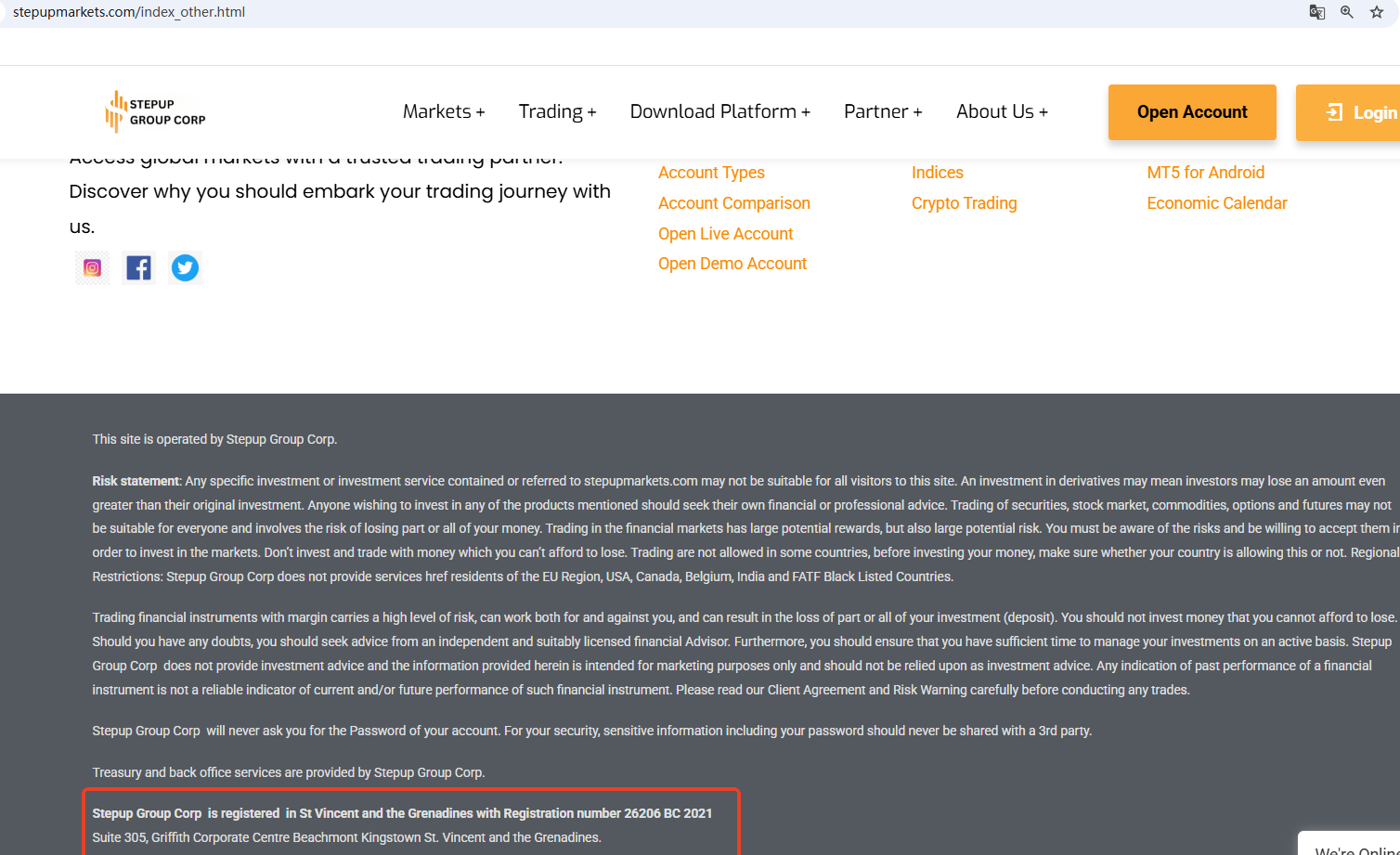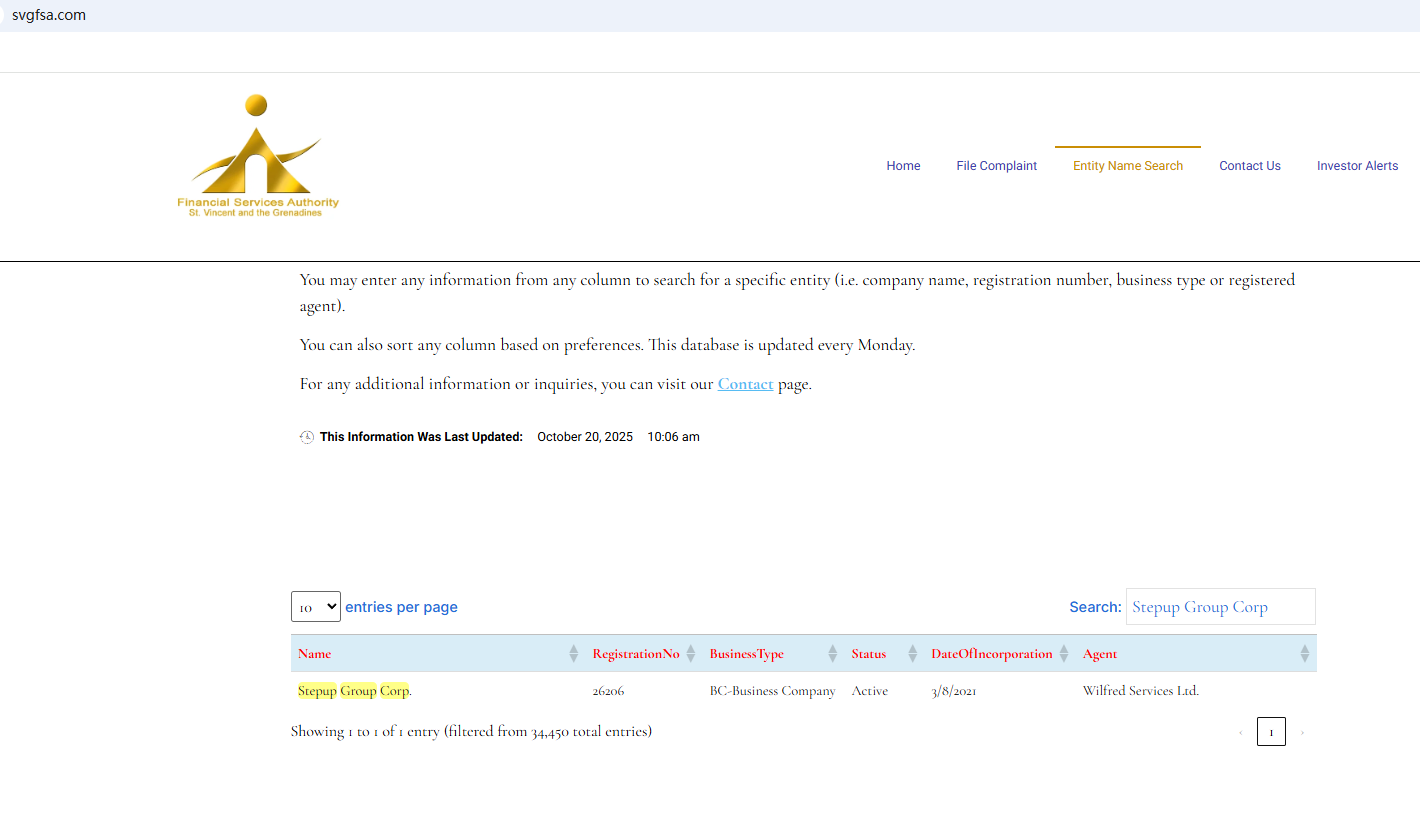 Stepup Group Corp claims to be registered with the St. Vincent and the Grenadines Financial Services Authority (SVG FSA). While this registration remains valid, the SVG FSA does not have the authority to regulate forex and does not constitute a valid forex license. Furthermore, Stepup Group Corp does not appear to be authorized by any reputable financial regulator, raising serious concerns about potential fraud.