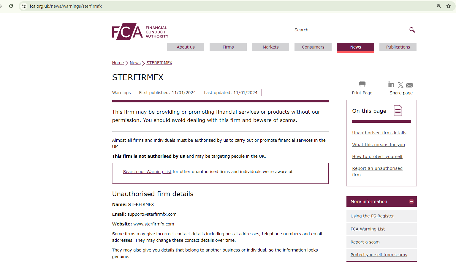On January 11, 2024, the Financial Conduct Authority (FCA) issued a warning against Sterfirm Asset Trade (STERFIRMFX), believing this company might be providing financial services or products without proper authorization in the UK. https://www.fca.org.uk/news/warnings/sterfirmfx