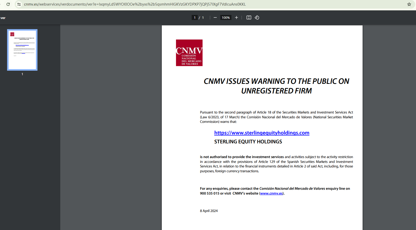On April 8, 2024, the Comisión Nacional del Mercado de Valores (CNMV) added sterlingequityholdings.com to its warning list for providing investment services without authorization. https://www.cnmv.es/portal/ResultadoBusqueda.aspx?tipo=1&nombre=STERLINGEQUITYHOLDINGS