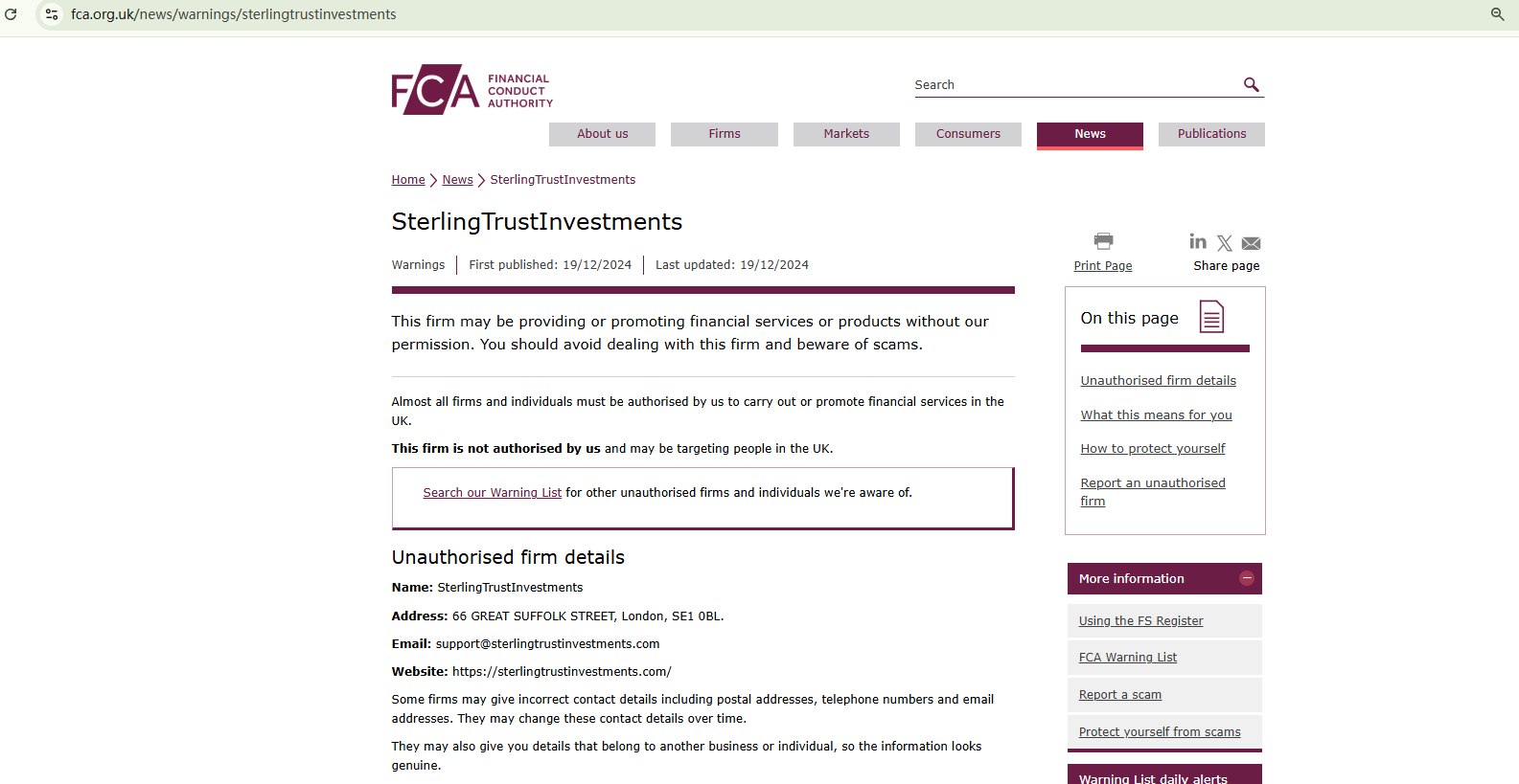 On December 19, 2024, the Financial Conduct Authority (FCA) issued a warning against SterlingTrustInvestments, believing this company might be providing financial services or products without proper authorization in the UK. https://www.fca.org.uk/news/warnings/sterlingtrustinvestments