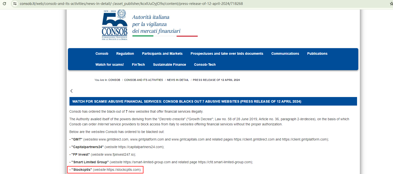 On April 12, 2024, the Italian Companies and Exchange Commission (CONSOB) ordered Stockcptls' website to be blacked out since it offers financial services illegally in Italy. https://www.consob.it/web/consob-and-its-activities/news-in-detail/-/asset_publisher/kcxlUuOyjO9x/content/press-release-of-12-april-2024/718268