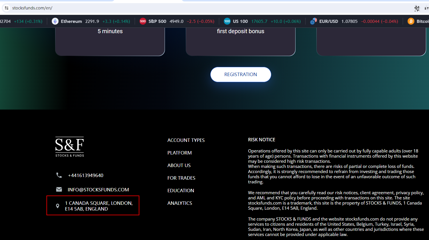 BrokersView found that the domain "stocksfunds.com" is currently inaccessible. This is widely regarded as a significant red flag, as the suspension of a broker's website often points to underlying regulatory or operational issues.