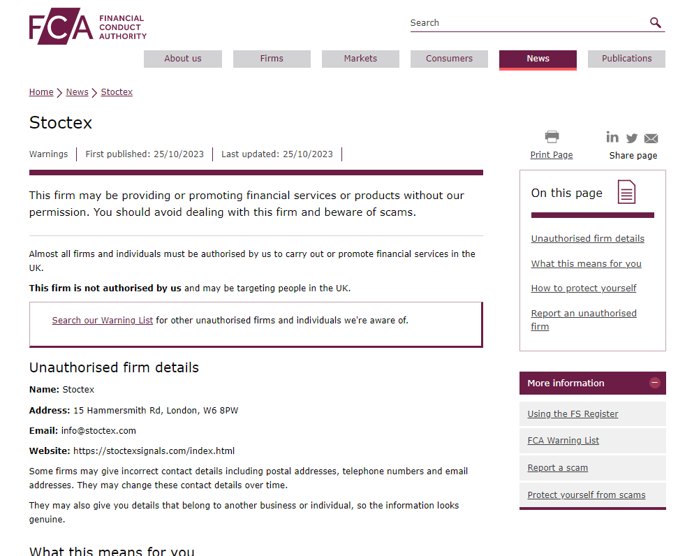 On 25 October 2023, the United Kingdom Financial Conduct Authority (UK FCA) issued a warning that Stoctex was providing financial services or products in the UK without authorisation. You may visit: https://www.fca.org.uk/news/warnings/stoctex