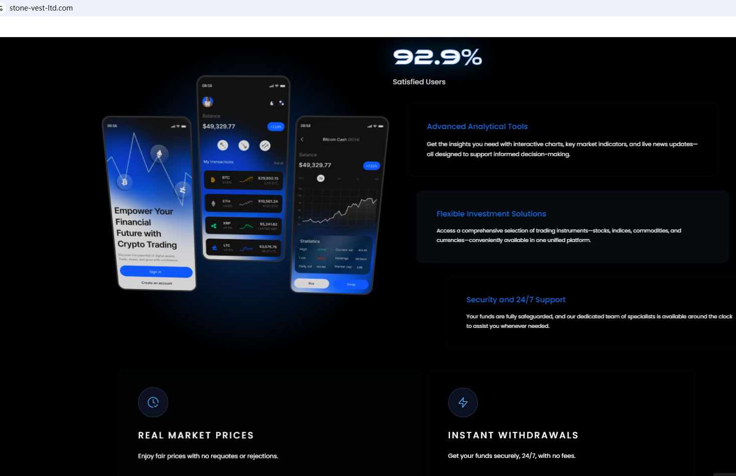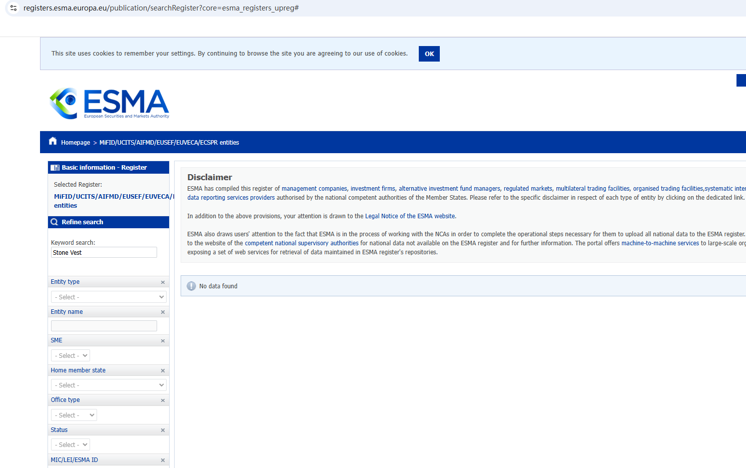 According to its website, it claims to be authorized and regulated under the European Financial Security. Upon investigation, no matching information was found in the European Securities and Markets Authority (ESMA). In addition, the Federal Financial Supervisory Authority (BaFin) issued a warning against Stone Vest for the lack of the required authorization.