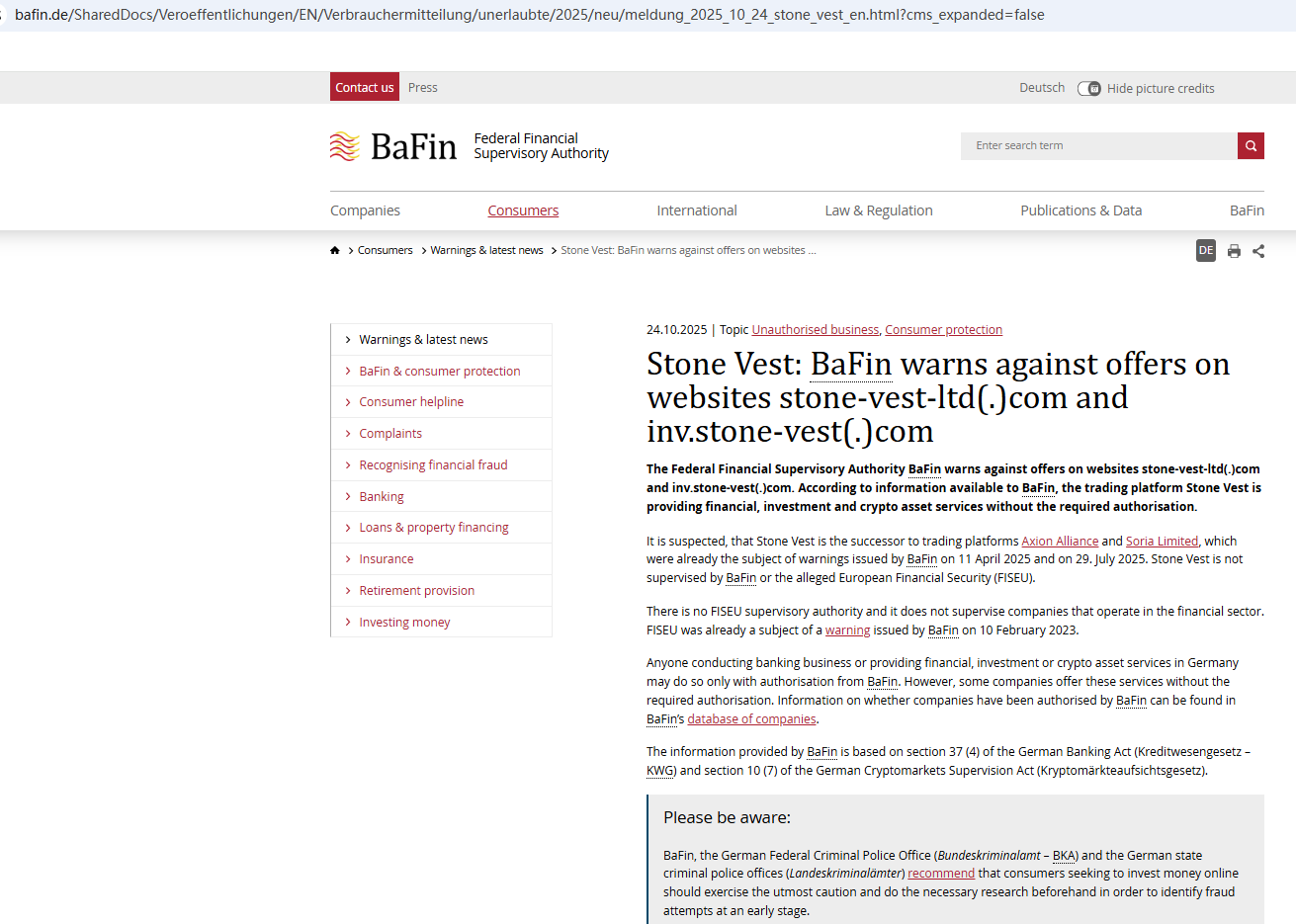 On Oct 24, 2025, the Federal Financial Supervisory Authority (BaFin) issued a warning against Stone Vest for the lack of the required authorization. https://www.bafin.de/SharedDocs/Veroeffentlichungen/EN/Verbrauchermitteilung/unerlaubte/2025/neu/meldung_2025_10_24_stone_vest_en.html?cms_expanded=false
