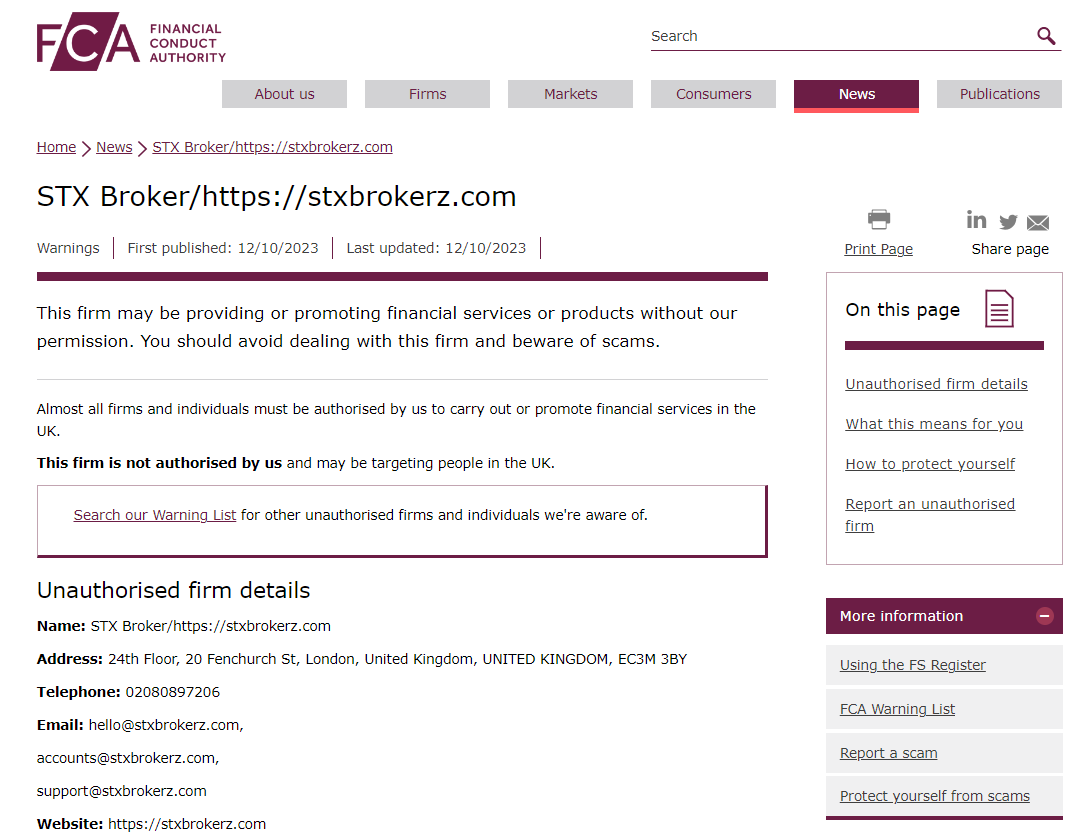 On 12 October 2023, the United Kingdom Financial Conduct Authority (UK FCA) issued a warning that STX Broker was providing financial services or products in the UK without authorisation. You may visit: https://www.fca.org.uk/news/warnings/stx-broker-https-stxbrokerzcom
