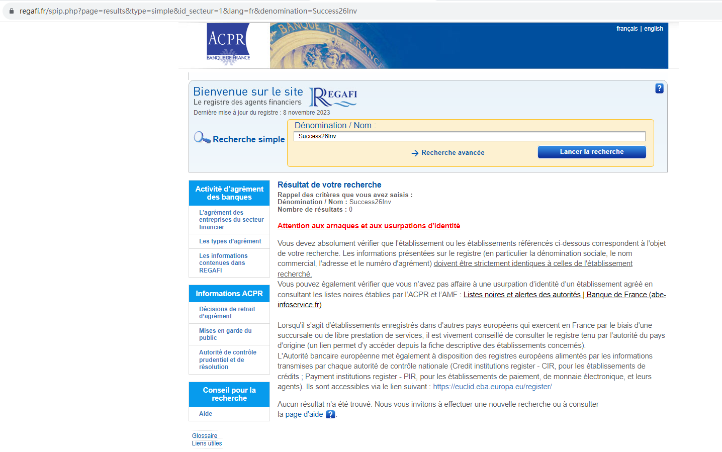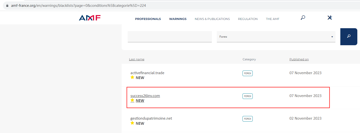 On 7 November 2023, the Autorité des Marchés Financiers (AMF) issued a warning that Success26Inv was providing financial services or products without authorisation. You may visit: https://www.amf-france.org/en/warnings/blacklists?page=0&conditions%5Bcategorie%5D=224