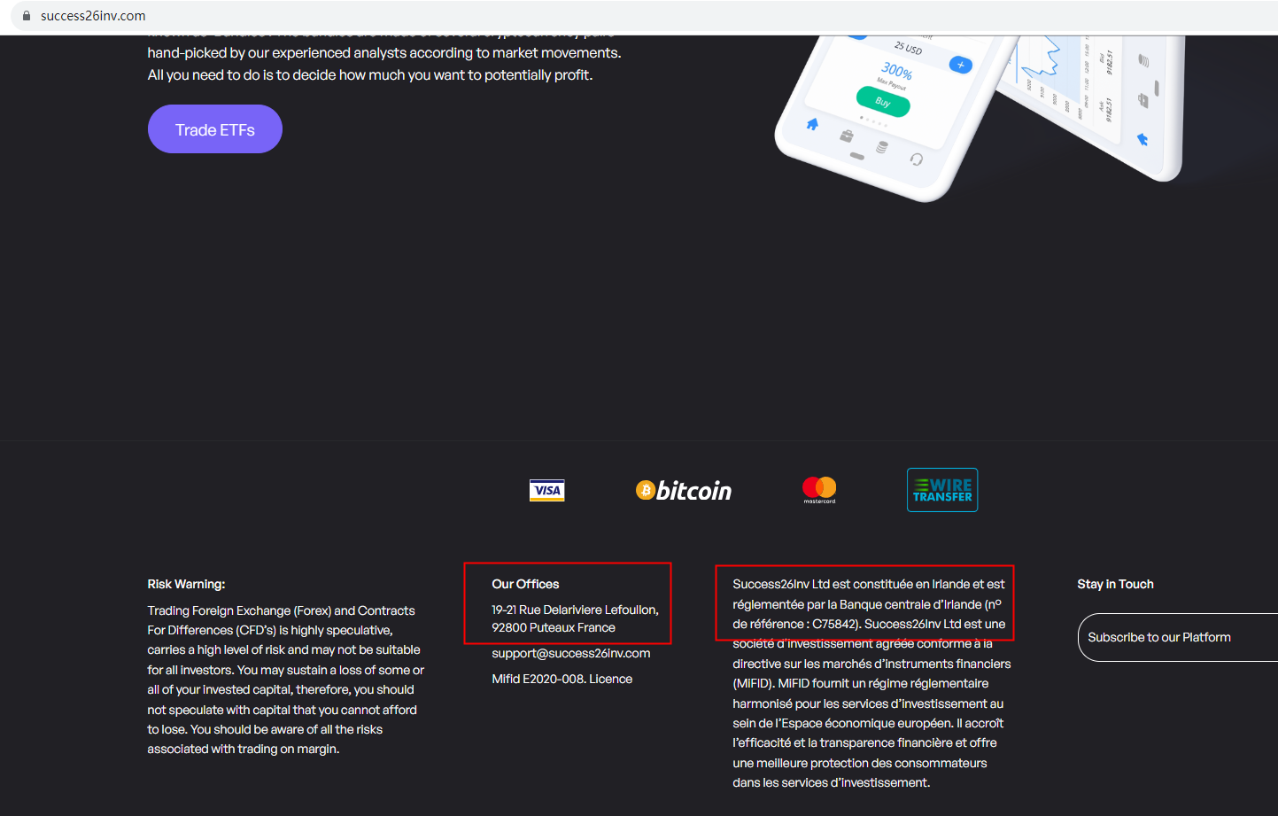 Success26Inv claims to be regulated by Central Bank of Ireland (CBI), we searched the CBI but found no matching results. And this broker locates in France, so we searched the Autorité des Marchés Financiers (AMF) but found no matching results. It is a red flag.