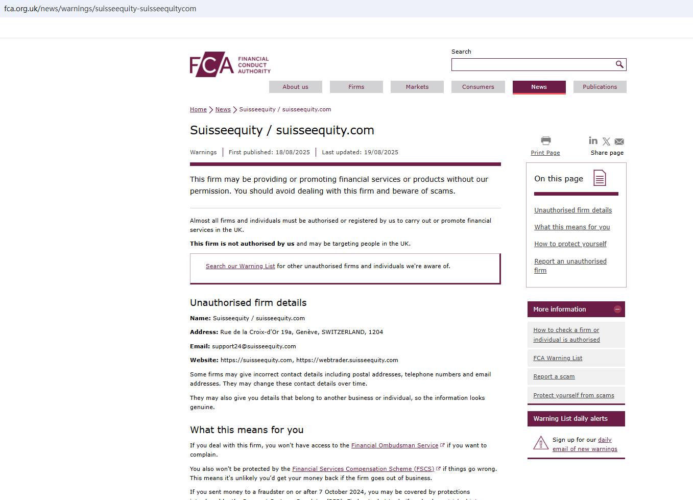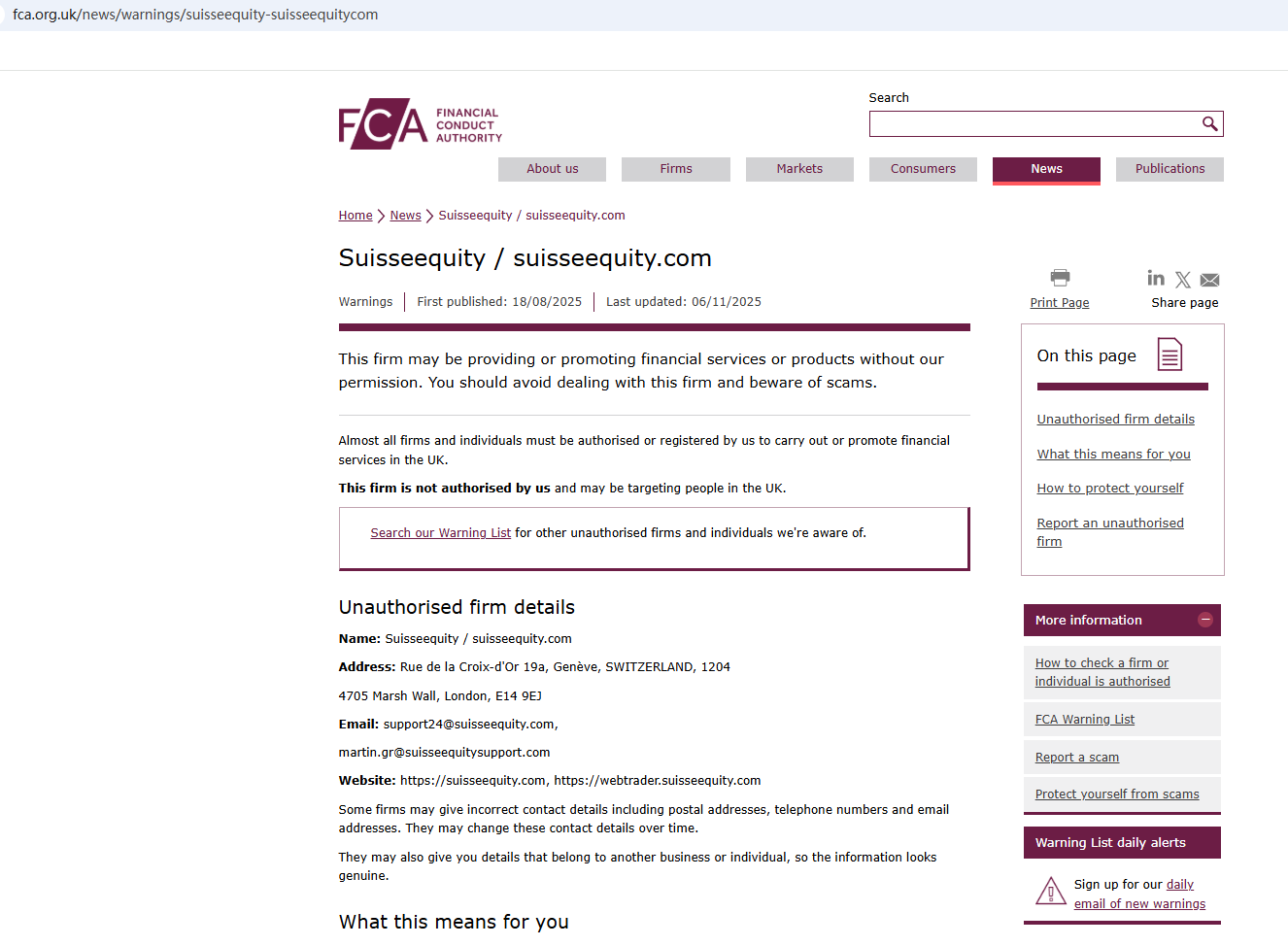 On Nov 6, 2025, the Financial Conduct Authority (FCA) issued a warning regarding Suisseequit, suspecting that this company may be offering financial services or products without the necessary authorization. https://www.fca.org.uk/news/warnings/suisseequity-suisseequitycom