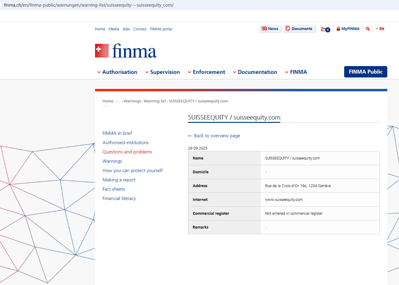 On Sept 29, 2025, the Swiss Financial Market Supervisory Authority (FINMA) issued a warning against Suisseequity, stating that this broker is not entered in its commercial register. https://www.finma.ch/en/finma-public/warnungen/warning-list/suisseequity---suisseequity_com/