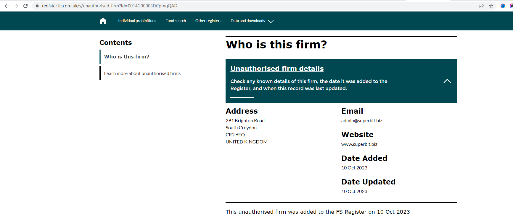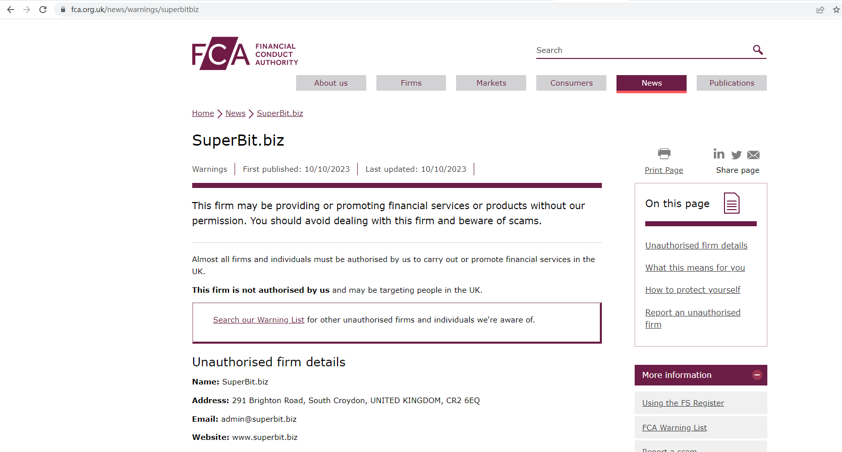 On 10 October 2023, the United Kingdom Financial Conduct Authority (UK FCA) issued a warning that SuperBit.biz was providing financial services or products in the UK without authorisation. You may visit: https://www.fca.org.uk/news/warnings/superbitbiz