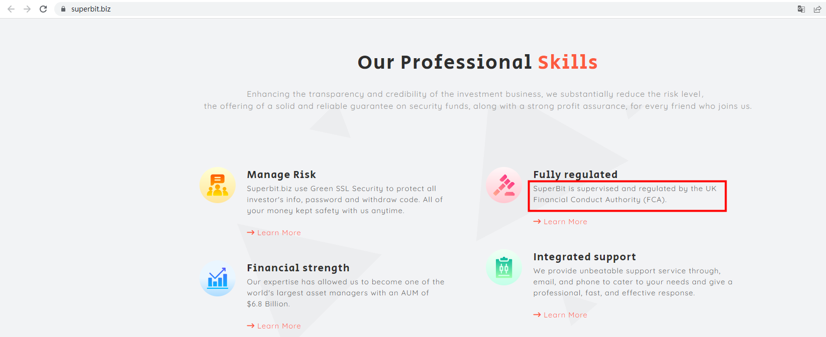 SuperBit.biz claims to be regulated by the United Kingdom Financial Conduct Authority (UK FCA), we searched the FCA and found it was unauthorised. It is a red flag.