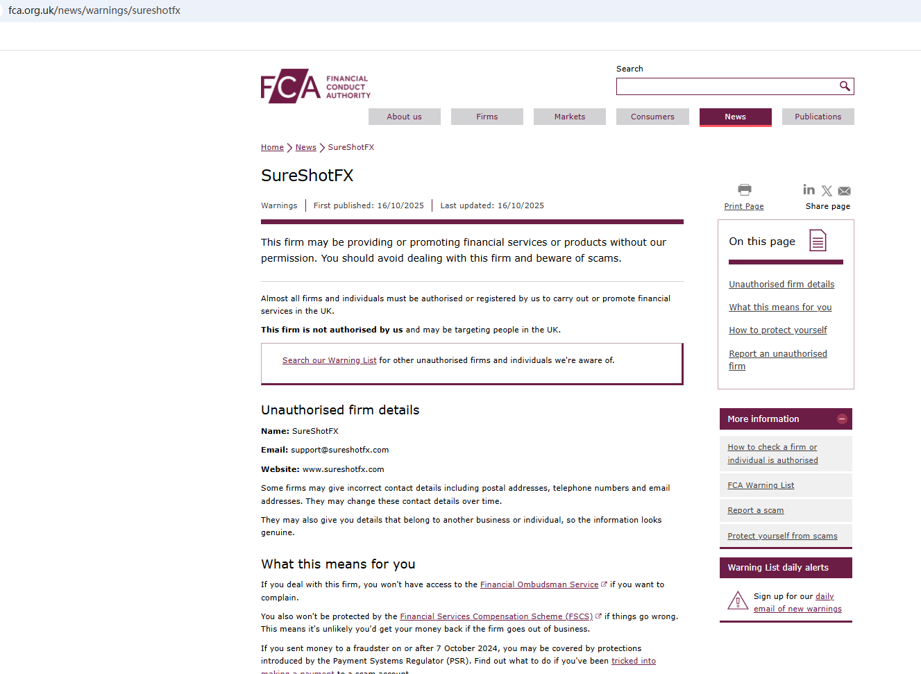 On Oct 16, 2025, the Financial Conduct Authority (FCA) issued a warning regarding SureShotFX, suspecting that this company may be offering financial services or products without the necessary authorization. https://www.fca.org.uk/news/warnings/sureshotfx