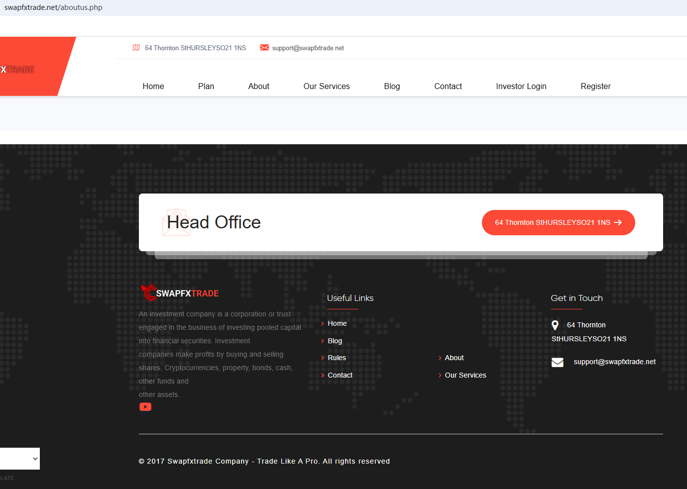 According to its website, it is located in the UK. Upon investigation, we found that the Financial Conduct Authority (FCA) issued a warning against Swapfxtrade, believing this company might be providing financial services or products without proper authorization in the UK.