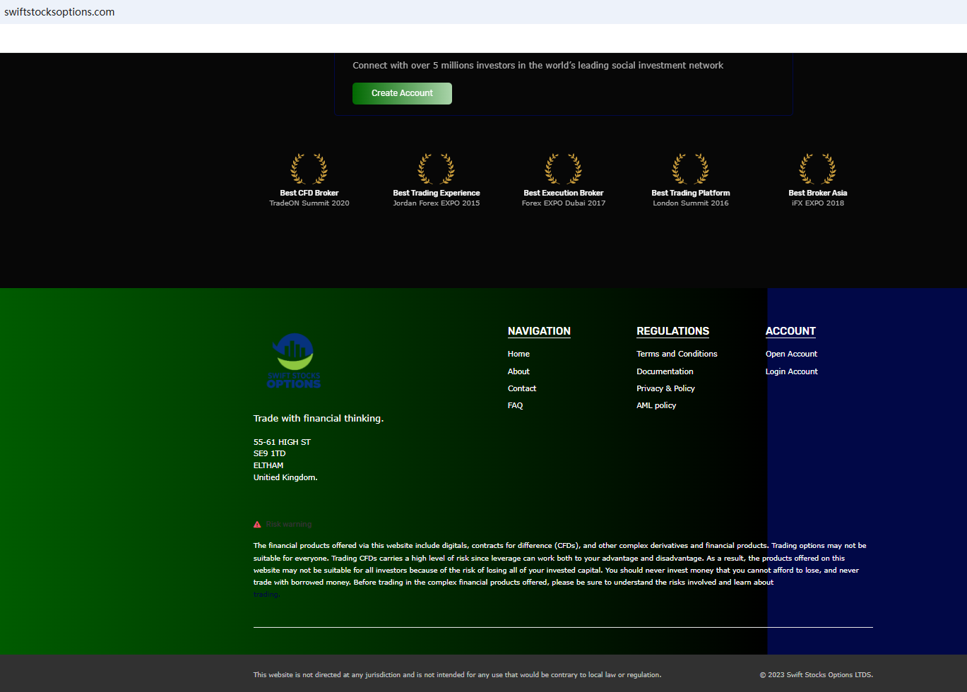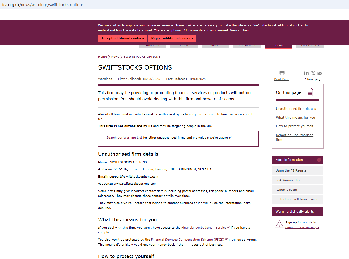 On March 18, 2025, the Financial Conduct Authority (FCA) issued a warning against SWIFTSTOCKS OPTIONS for the lack of the required authorization. https://www.fca.org.uk/news/warnings/swiftstocks-options