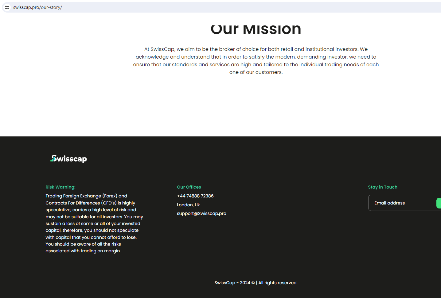 On March 20 2024, the Finansinspektionen (FI) issued a warning against Swisscap, stating that this broker is not entered in its commercial register. https://www.fi.se/en/our-registers/investor-alerts/investor-alerts/2024/mars/warning-regarding-swisscap/