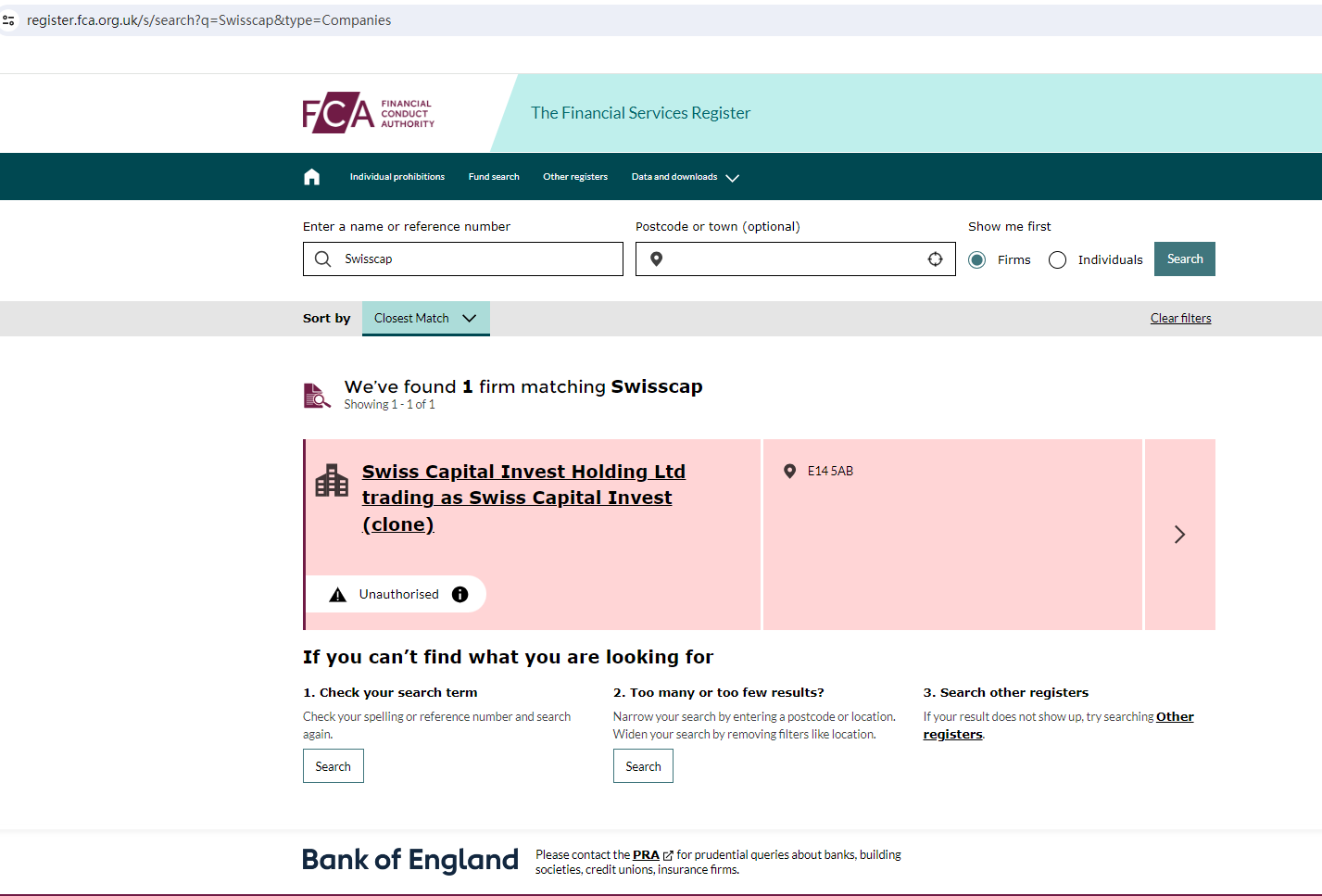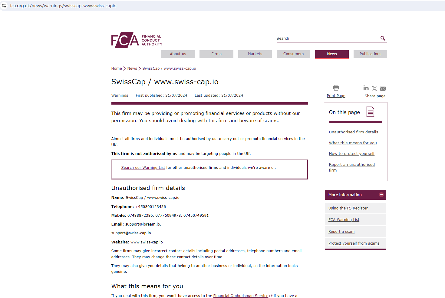 On 31 July 2024, the United Kingdom Financial Conduct Authority (FCA) issued a warning against SwissCap, believing this company might be providing financial services or products without authorisation in the UK. You may visit: https://www.fca.org.uk/news/warnings/swisscap-wwwswiss-capio