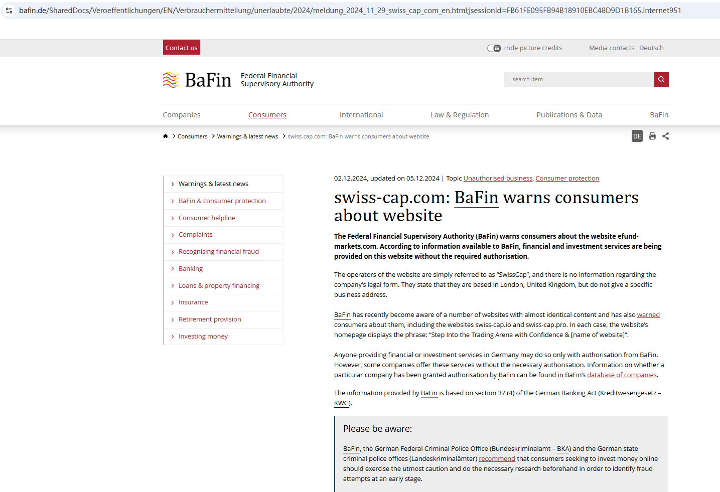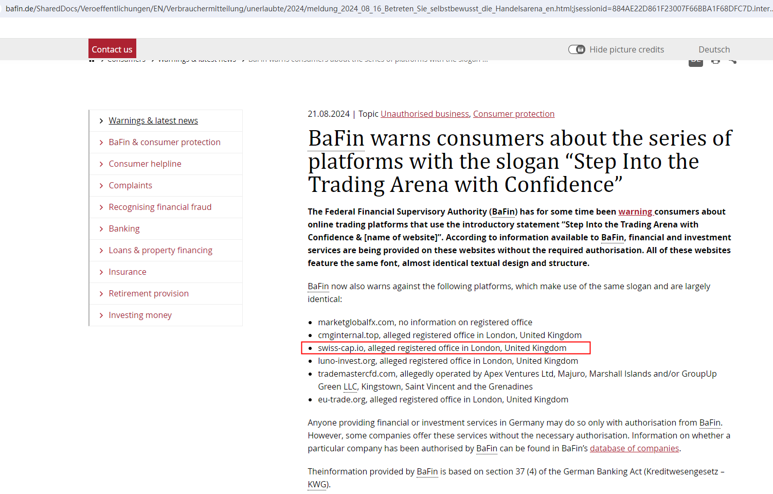 On August 21, 2024, the Federal Financial Supervisory Authority (BaFin) warned consumers about the website swiss-cap.io, stating that the financial and investment services are being provided on this website without the required authorization. https://www.bafin.de/SharedDocs/Veroeffentlichungen/EN/Verbrauchermitteilung/unerlaubte/2024/meldung_2024_08_16_Betreten_Sie_selbstbewusst_die_Handelsarena_en.html;jsessionid=884AE22D861F23007F66BBA1F68DFC7D.internet001